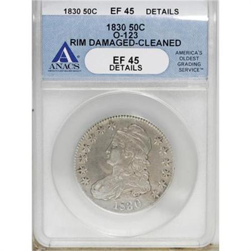 <B>1830 50C Small 0--Cleaned, Rim Damaged--ANACS. XF45 Details.</B></I> O-123. NGC Census: (118/1079). PCGS Population (96/760). Mintage: 4,764,800. Numismedia Wsl. Price for NGC/PCGS coin in XF45: $124. (#6156)<BR><BR><B>Coin Engraver:</B> John Reich<BR><BR><b>Shipping:</b> Coins & Currency (<a target="_blank" href="http://www.heritageauctions.com/common/shipping.php">view shipping information</a>)