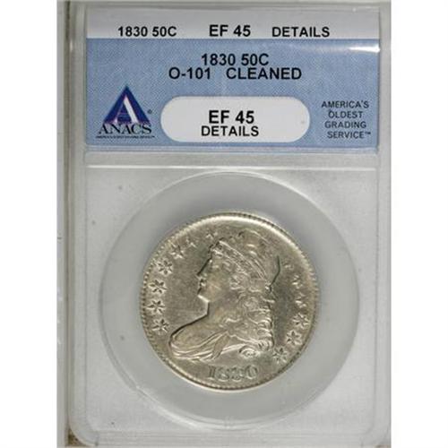 <B>1830 50C Small 0--Cleaned--ANACS. XF45 Details. </B></I>O-101. NGC Census: (118/1079). PCGS Population (96/760). Mintage: 4,764,800. Numismedia Wsl. Price for NGC/PCGS coin in XF45: $124. (#6156)<BR><BR><B>Coin Engraver:</B> John Reich<BR><BR><b>Shipping:</b> Coins & Currency (<a target="_blank" href="http://www.heritageauctions.com/common/shipping.php">view shipping information</a>)