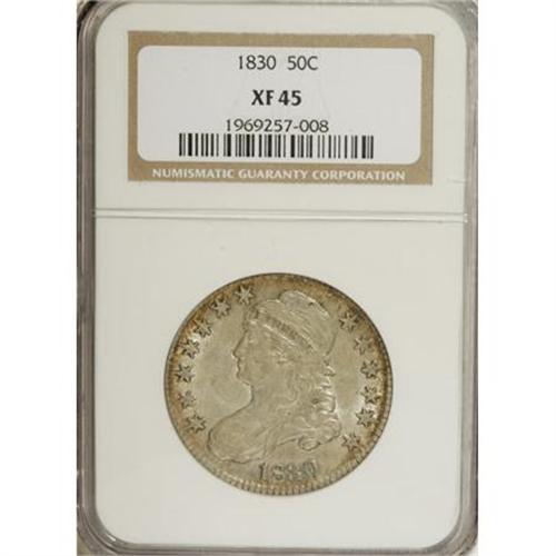 <B>1830 50C Small 0 XF45 NGC.</B></I> NGC Census: (106/1045). PCGS Population (90/731). Mintage: 4,764,800. Numismedia Wsl. Price for NGC/PCGS coin in XF45: $124. (#6156)<BR><BR><B>Coin Engraver:</B> John Reich<BR><BR><b>Shipping:</b> Coins & Currency (<a target="_blank" href="http://www.heritageauctions.com/common/shipping.php">view shipping information</a>)