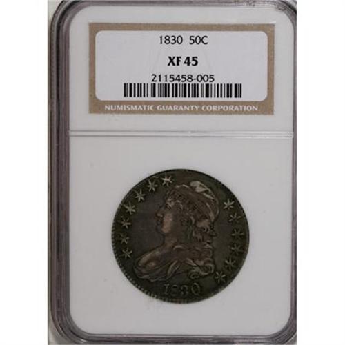 <B>1830 50C Small 0 XF45 NGC.</B></I> . NGC Census: (120/1088). PCGS Population (98/767). Mintage: 4,764,800. Numismedia Wsl. Price for NGC/PCGS coin in XF45: $202. (#6156)<BR><BR><B>Coin Engraver:</B> John Reich<BR><BR><b>Shipping:</b> Coins & Currency (<a target="_blank" href="http://www.heritageauctions.com/common/shipping.php">view shipping information</a>)