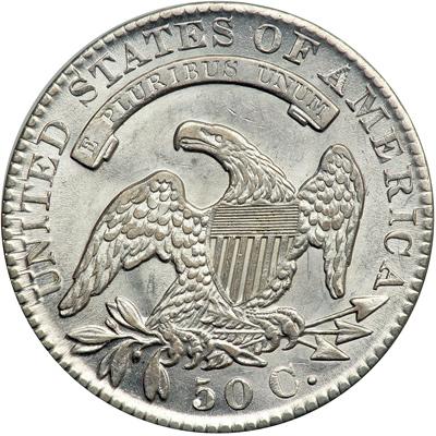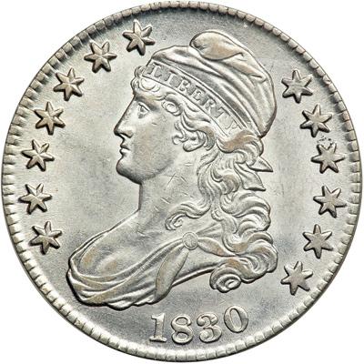 1830 Capped Bust Half Dollar. Small 0. PCGS graded AU-58. Quite lustrous and carefully preserved (PCGS # 6156) .