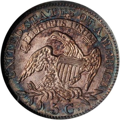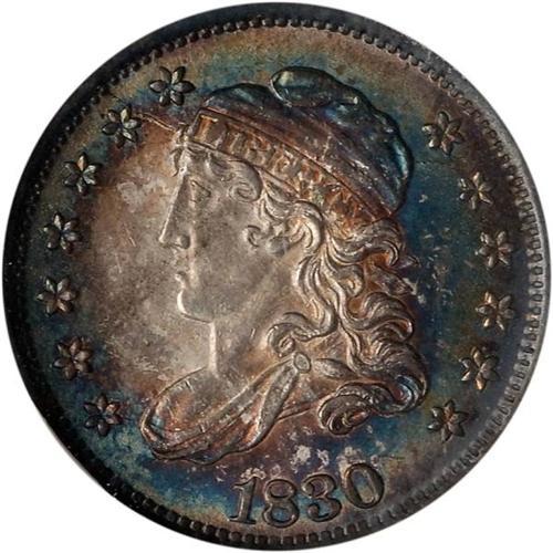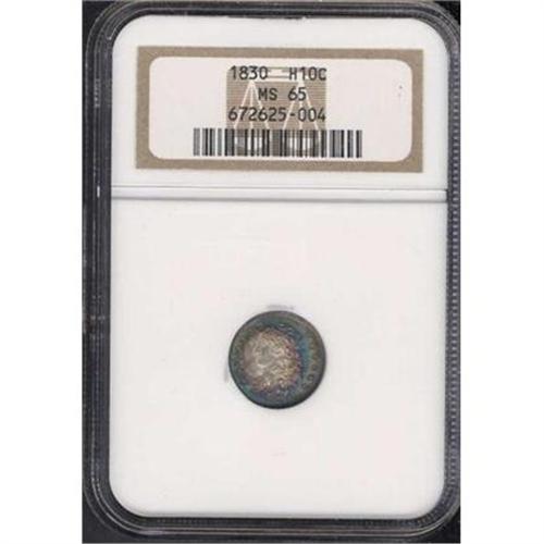 <b>1830 Capped Bust Half Dime. NGC graded MS65.</b> The surfaces are sleek and glowing with a healthy snow white color in the familiar "spotlight" pattern. There is wonderful deep electric blue toning along with shimmering steel-gray iridescence. Probably a good many are not as carefully struck as this handsome MS65 Gem, with no suggestion or even a whisper of weakness at the stars or main hair curls <b>(PCGS # 4277)</b>