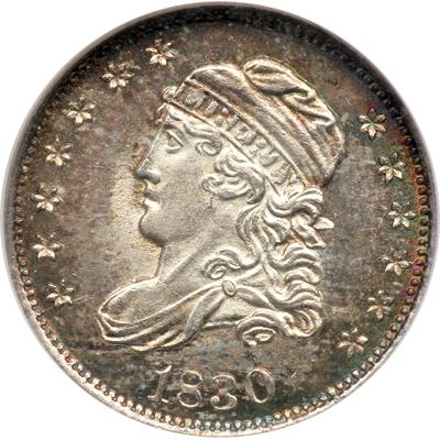 1830 Capped Bust Half Dime. . LM-4.1, V-3. NGC graded MS-66 Prooflike. Well struck with lovely blue and lilac colors. A total of 14 die marriages are known for the half dime coinage dated 1830. This coinage was accomplished through the use of six obverse and eight reverse dies. Total mintage for the year was 1,240,000 coins, however, many of these were coins dated 1829, while other examples dated 1830 were actually struck in 1831. In fact, one marriage dated 1830 was minted after all 1831 coins were struck. Displaying a uniform satiny brilliance on each side. Full, bold transfer from the die to planchet seen in the main devices. A jewel!