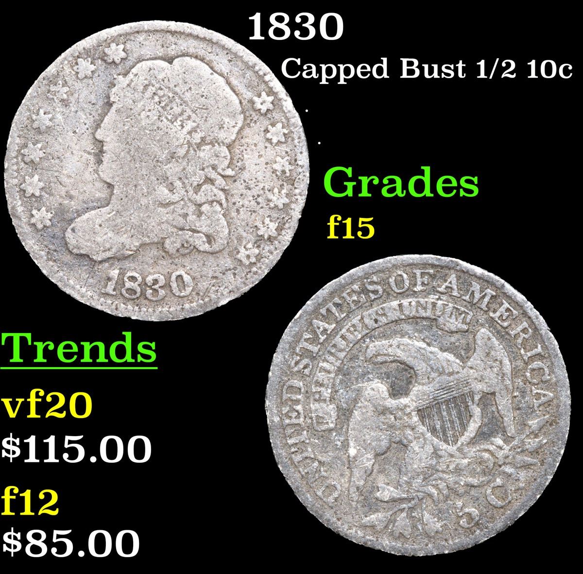 1830 . . Capped Bust Half Dime 1/2 10c Grades f+.