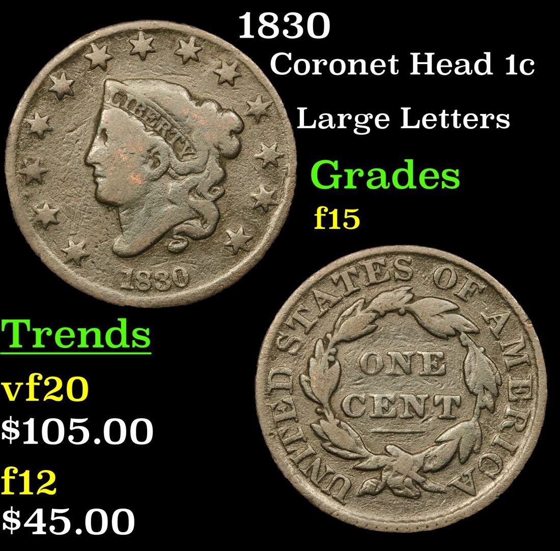 1830 Large Letters . Coronet Head Large Cent 1c Grades f+.