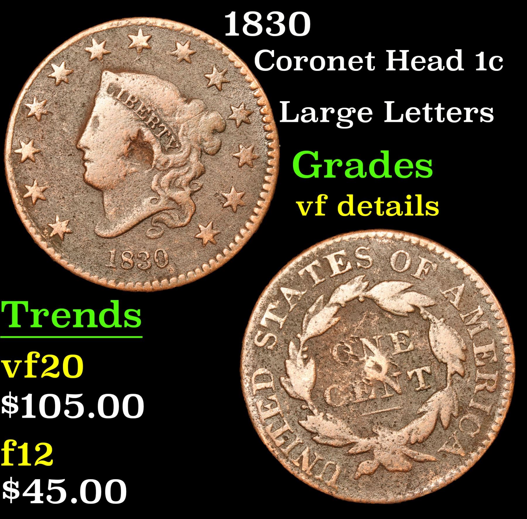 1830 Coronet Head Large Cent 1c Grades vf details. Larege Letters