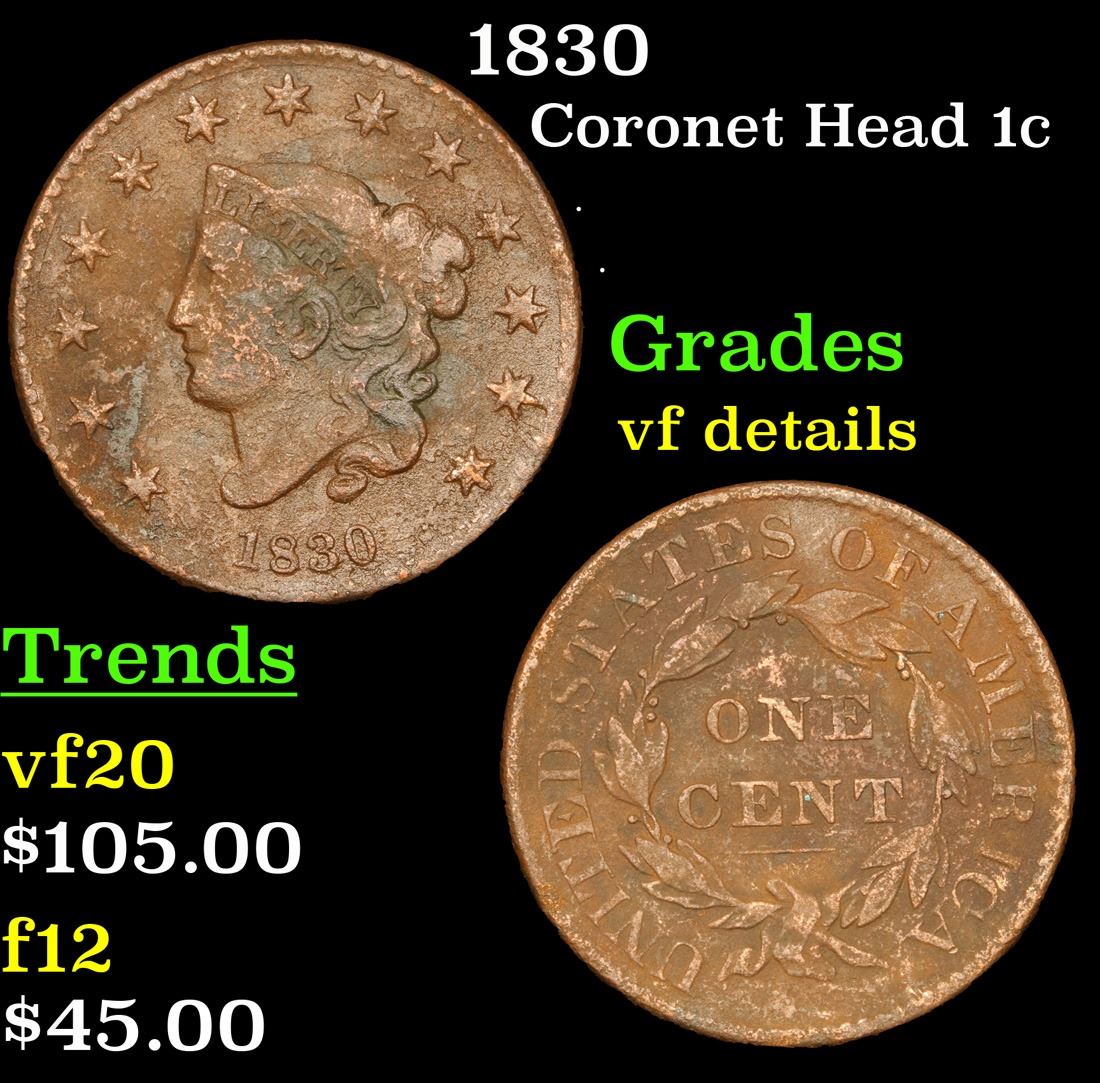 1830 . . Coronet Head Large Cent 1c Grades vf details.