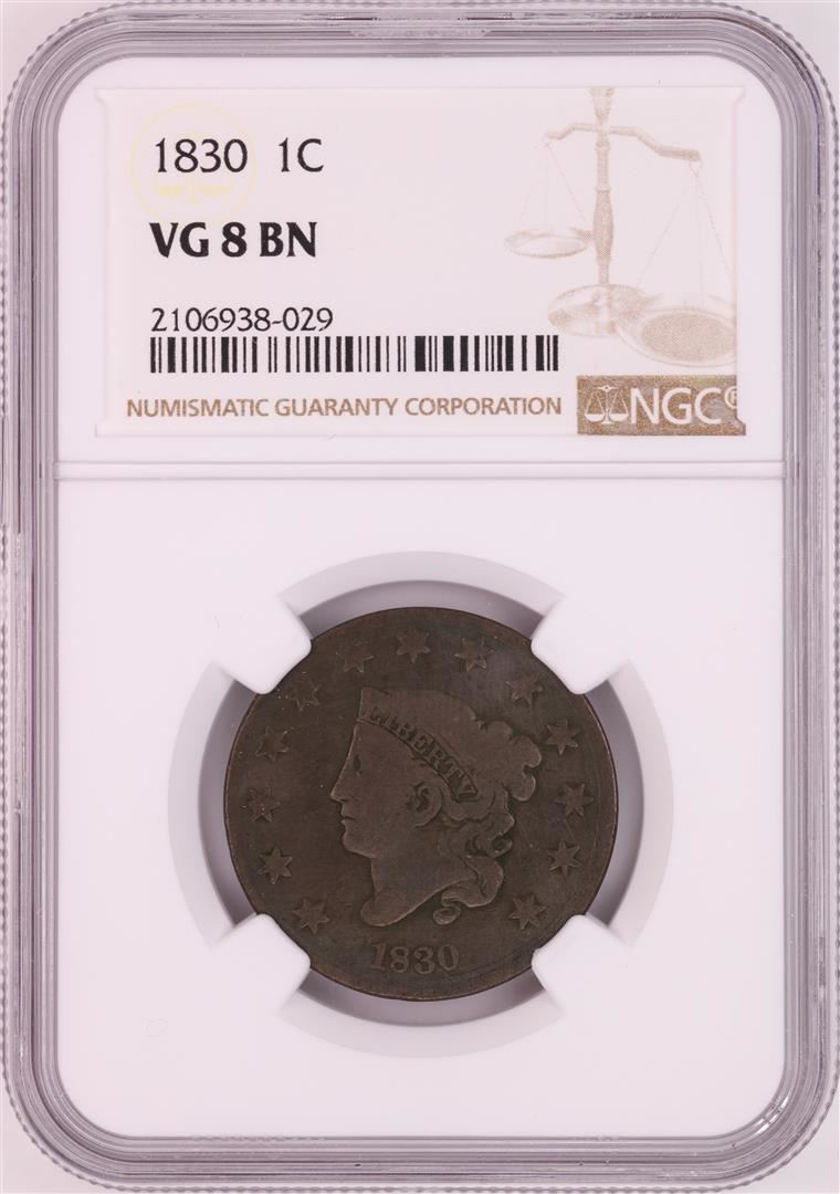 One 1830 Coronet Head Large Cent Coin NGC VG8BN. NGC Certified.