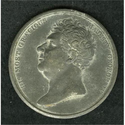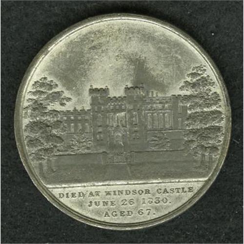 <B>1830 Death of George IV Medal.</B></I> White metal, 50.5 mm. Elmer-1219. Obverse: naked bust left. Reverse: Windsor Castle. A well struck and unworn example with charcoal-gray "tin pest" on the obverse and portions of the reverse field.<BR><BR><b>Shipping:</b> Coins & Currency (<a target="_blank" href="http://www.heritageauctions.com/common/shipping.php">view shipping information</a>)