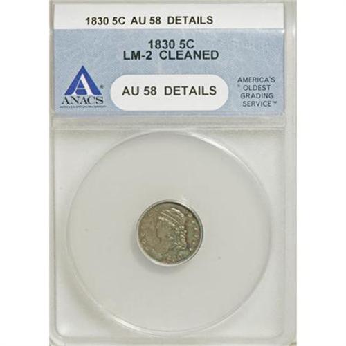 <B>1830 H10C --Cleaned--ANACS. AU58 Details.</B></I> LM-2. PCGS Population (49/306). NGC Census: (60/348). Mintage: 1,200,000. Numismedia Wsl. Price for NGC/PCGS coin in AU58: $242. (#4277)<BR><BR><B>Coin Engraver:</B> William Kneass<BR><BR><b>Shipping:</b> Coins & Currency (<a target="_blank" href="http://www.heritageauctions.com/common/shipping.php">view shipping information</a>)