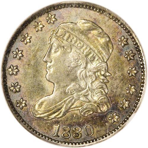<B>1830<H10C>--LM Plate Coin--MS62 NGC.</B></I> V-4, LM-6, R.5. Minute spots near the stars and right (facing) wingtip confirm this piece as the plate coin for the rare LM-6. Beautifully toned rose, lime, gold, and electric-blue. The mildly prooflike fields are unblemished for the grade.