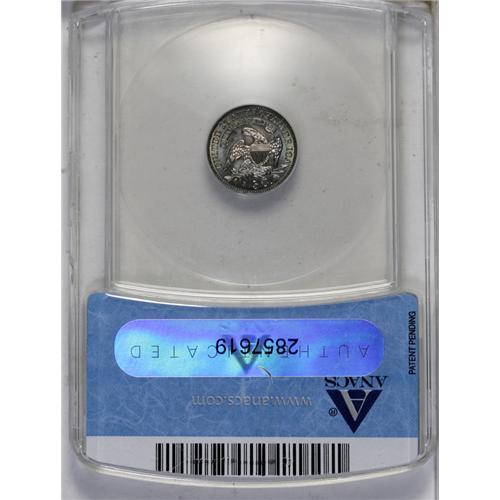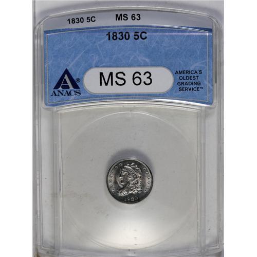 <B>1830<H10C> MS63 ANACS.</B></I> V-3, LM-4, R.2. Plum-gray and aqua embrace this lustrous and pleasing half dime. The strike is good, and only a few delicate obverse hairlines preclude a finer grade.