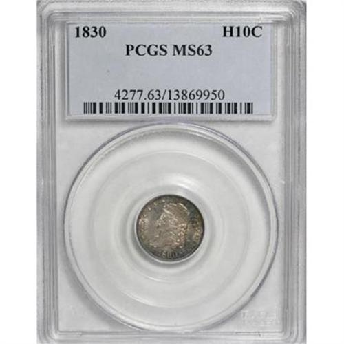 <B>1830 H10C MS63 PCGS.</B></I> V-7, LM-7, R.2. A wide space between stars 6 and 7 distinguish LM-7 from the otherwise similar LM-8, and the tip of the feather is right of the upright of 5 in the denomination. Multicolored toning visits portions of the obverse, while gold-tan patina gravitates to the reverse margins. Well struck, and a few minor handling marks.<BR><BR><B>Coin Engraver:</B> William Kneass<BR><BR><b>Shipping:</b> Coins & Currency (<a target="_blank" href="http://www.heritageauctions.com/common/shipping.php">view shipping information</a>)