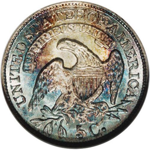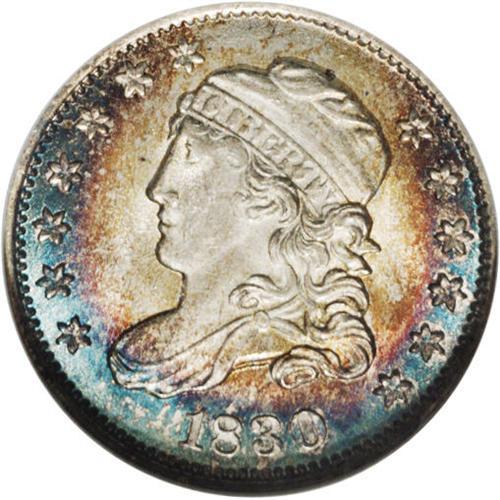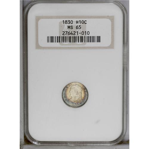 <B>1830<H10C> MS65 NGC.</B></I> V-1, LM-14, R.3. The scroll above the eagle is shifted to the left, with the S of PLURIBUS centered below the E in STATES, farther left than any other variety of the year. In fact, this position is farther left than any other reverse of the entire series from 1829 to 1837. Offered here is a solid Gem representative with sea-green and russet toning on each side that leaves relatively small windows of brilliance. Attractive, frosty luster is enhanced by an almost total lack of surface marks. We have offered several Choice or better 1830 V-1 half dimes in recent years, but none that could exceed the eye appeal of this example. Census: 39 in 65, 29 finer (3/06). <BR><BR><B>Important notice:</B> Heritage usually auctions material at the rate of 200-250 lots per hour. On some occasions eBay Live bid software or the Internet may not be able to keep up with the pace of the auction. We recommend placing a realistic absentee bid now as insurance to avoid disappointment. Occasionally the auctioneer may eliminate or reject an eBay Live bid, and the auctioneer may also reopen a lot after the close of the eBay live bidding (usually because we missed an audience bid), and may reject your bid even if it shows you as the winning bidder. By bidding via eBay Live, you agree that Heritage may award the lot to another bidder at its sole discretion under the circumstances described above or any other reasonable circumstances. Since eBay bids are not shown to us until we open the lot on the floor, we treat those bids just like floor bids. In most cases the floor responds before the eBay bid is presented to us, due to Internet lag time, so for consistency we have made it a policy that floor bids are always considered first over tie eBay live bids. Also please note that all Heritage lots purchased through eBay Live carry a 20% Buyer's Premium. Please make sure you read the Terms and Conditions before you bid. This lot is being auctioned in conjunction with a live floor auction by Heritage Galleries & Auctioneers. All final auction and invoice information will be supplied by Heritage Galleries & Auctioneers, and all other information should be considered preliminary. Lot:1872 <BR><BR><B>Winning Notification and Billing:</B> After the FINAL session in this auction is complete, Heritage will send e-mail and snail mail invoices. This process normally takes several days. All final auction and invoice information will be supplied by Heritage Galleries & Auctioneers, and all other information should be considered preliminary. <BR><BR>This auction will be conducted on a live auction floor and over the Internet through eBay Live. If you choose to place an absentee bid, please take a moment to <font color='#0000ff'><u><a href='http://pages.ebay.com/liveauctions/help/before/laabsentee.html'>learn how eBay Live absentee bidding works</a></u></font><font color='#000000'>