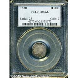 <B>1830 H10C MS66 PCGS.</B></I> V-8, LM-3, R.2. The A in STATES is high, and a faint die crack passes through the initial star. Golden-brown, lilac, mauve, and forest-green colors endow this exquisitely struck and splendidly preserved premium Gem. Although the 1830 Half Dime is not particularly elusive for an early silver issue, not many survivors can match the originality, eye appeal, and quality of the present piece. Population: 16 in 66, 7 finer (2/05).