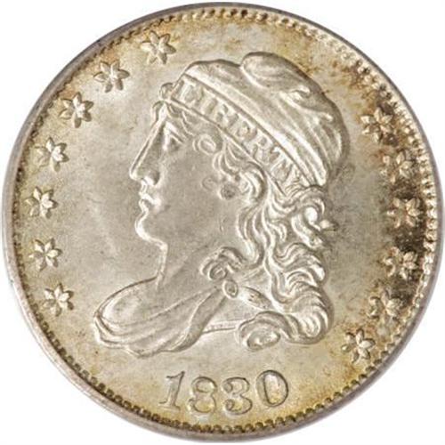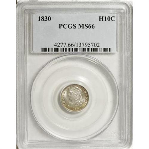 <B>1830 H10C MS66 PCGS.</B></I> V-7, LM-7, R.2. A wide space between stars 6 and 7 distinguish LM-7 from the otherwise similar LM-8, and the tip of the feather is right of the upright of 5 in the denomination. Lustrous, well preserved surfaces display whispers of peripheral golden-tan, accented in places with electric-blue. The design features are well impressed. Population: 20 in 66, 7 finer (8/07).<BR><BR><B>Coin Engraver:</B> William Kneass<BR><BR><b>Shipping:</b> Coins & Currency (<a target="_blank" href="http://www.heritageauctions.com/common/shipping.php">view shipping information</a>)