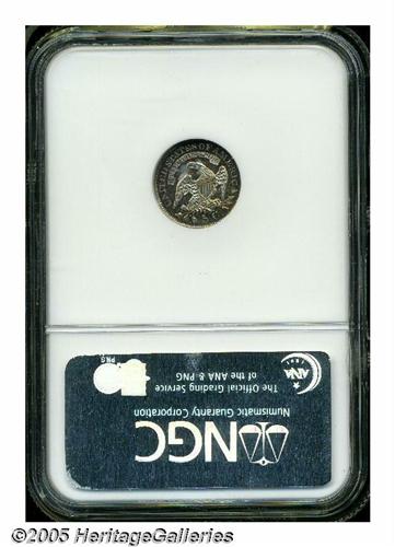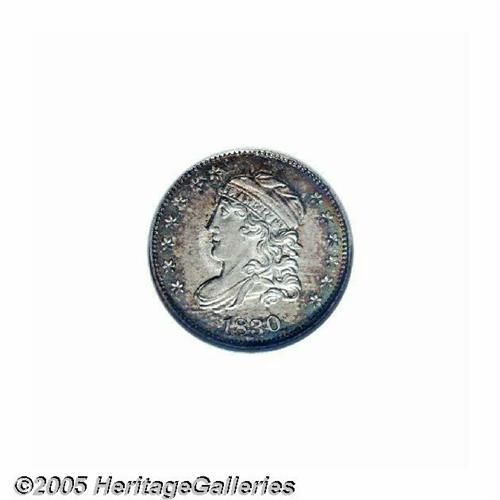 <B>1830<H10C> MS66 Prooflike NGC.</B></I> V-8, LM-3, R.2. Apple-green and gold colors embrace the obverse border, and rose-red and aquamarine hues endow the reverse periphery, while the centers are only faintly toned. The strike is pinpoint sharp, and the surfaces are undisturbed. As of (5/05), NGC has certified just two 1830 Half Dimes as Prooflike: the present piece, and another at the MS65 level.