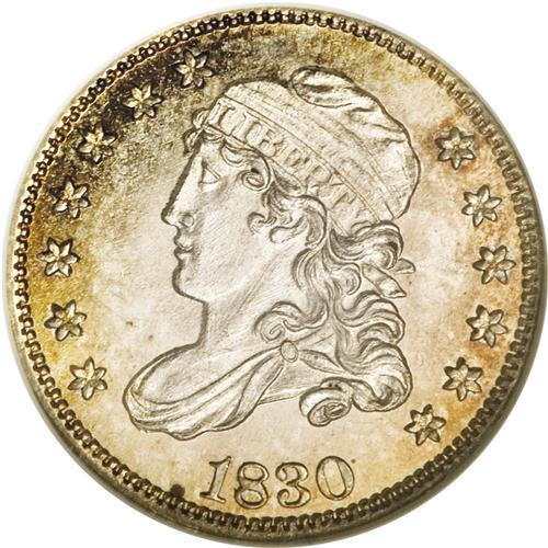 <B>1830 H10C PR66 NGC.</B></I> V-5, LM-9.1, R.7 as a proof. Proof 1830 half dimes are extremely rare. As of (9/06), NGC has certified only two, the present piece and another as PR64. An additional PCGS PR65 creates a total third-party census of three examples. One of these proofs (although not the present piece) may be the Eliasberg specimen, which was uncertified in its 1996 auction appearance. Over the years, any number of prooflike pieces have been offered as proofs, but the status of the current lot is unquestioned. The portrait is thickly frosted, and the eagle is also icy, despite the presence of original golden-brown peripheral toning. The strike is needle-sharp, and the fields are flashy. A couple of trivial hairlines near star 2 and a pinpoint spot at 7 o'clock decide the grade.<BR><I>Ex: Long Beach Connoisseur Collection (Bowers and Merena, 8/99), lot 79, which realized $18,400; Benson Collection, Part II (Ira and Larry Goldberg, 2/02), lot 350, which realized $23,172.</B></I><BR><I>From The Jones Beach Collection.</B></I><BR><BR><b>Shipping:</b> Coin/Currency (<a target="_blank" href="http://www.heritageauctions.com/common/shipping.php">view shipping information</a>)