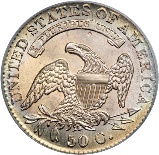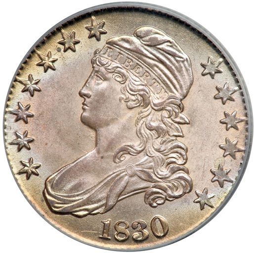 1830 Large 0 Overton 122 Rarity 1. ICG graded MS-64. Nicely toned. Well struck for this variety. All stars on right entirely flat, a hallmark of this variety. On the reverse 50C is well centered. The 5 has a short stubby top. I is slightly right of being centered under T. Left border of shield extends right. Condition Census.