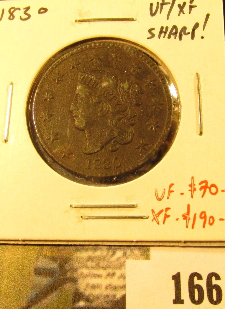 1830 Large Cent, VF/XF (sharp details!), value VF = $70, XF = $190
