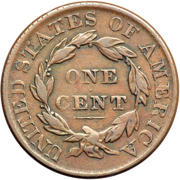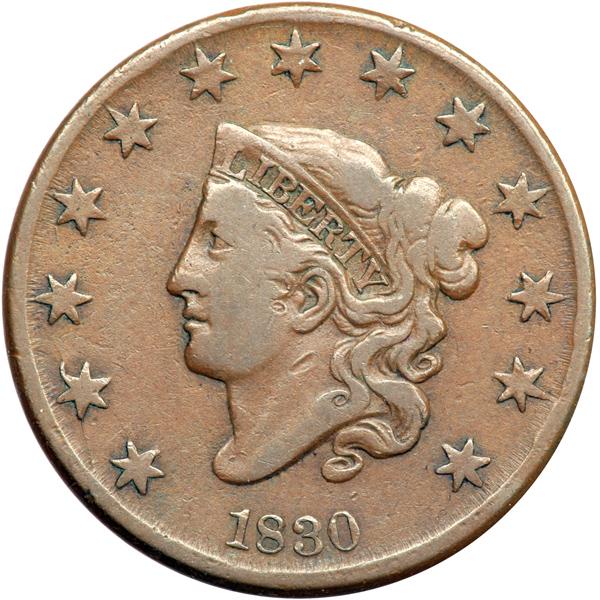 1830 N-1 R1 F15. Fine-15. Glossy medium brown. A dull, light nick on the first S in STATES is the only notable defect. Latest die state. The obverse dentils are gone and the upper left point of star 2 is badly bent by the earlier die crack (the "bend" is actually a chip out of the die caused by the crack). The additional die crack that connects stars 1 & 2 is clear and a new die crack connects the bust tip to the dentils under star 1. Apparently a very rare die state. DWH #3296.