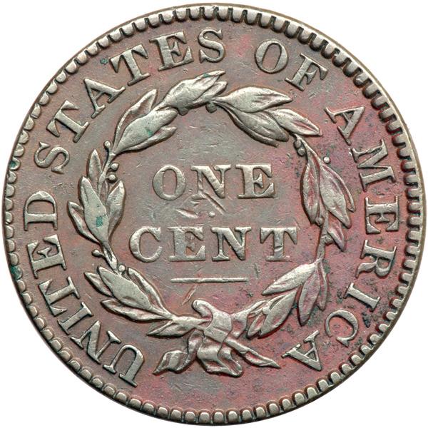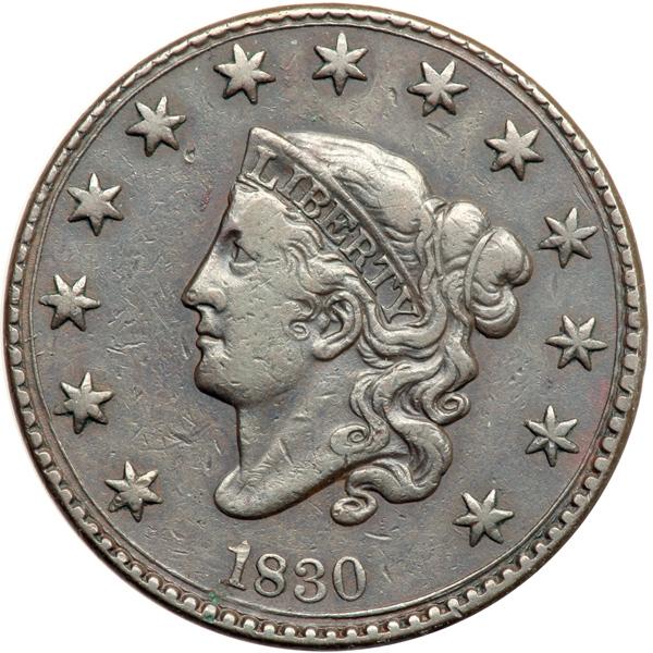 1830 N-1 R1 VF20. VF-20. Sharpness at least 5 points better with some light nicks scattered about both sides and microscopic specks of reddish verdigris sprinkled about the right side of the reverse, mostly around AMERICA. Rather glossy steel and light olive brown with reddish brown toning on the right side of the reverse. EDS, the obverse uncracked. DWH #3297.