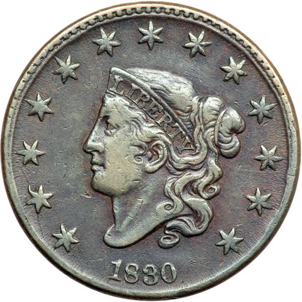 1830 N-1 R1 VF25. VF-25. Slightly sharper with a dull rim nick at ST, a light rim bruise at E in AMERICA, and other tiny contact marks scattered about both sides. Rather glossy steel and olive brown with lighter steel brown toning on the highpoints. LDS. The die crack through star 2 is strong and a chip on the upper left point of that star connects to the crack adding an oddly curved extension to that point. A new die crack connects stars 1 & 2. About half the dentils on the obverse remain visible. DWH #0715.
