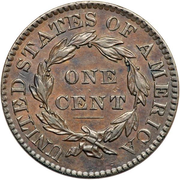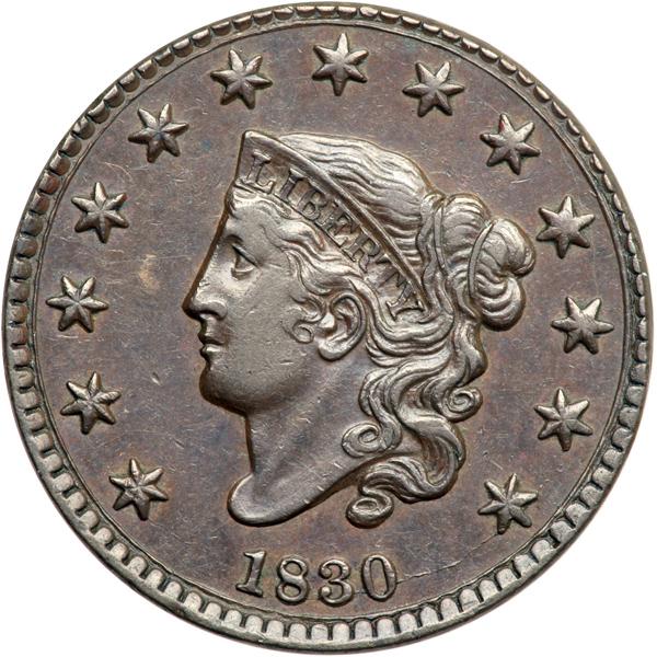 1830 N-10 R4+ EF40+. EF-40+. Choice glossy chocolate and steel brown with satiny luster covering the protected areas. Excellent eye appeal, very close to EF45. The only mark, and it is trivial, is a small, shallow low spot over the T in CENT, as struck. EDS with smooth, slightly reflective fields, especially on the reverse. The always-present die crack through the top of ATES is very light. Considered by John Wright to be the finest non-proof example of the variety. Called EF45 and second finest of the non-proofs in the Bland census. Noyes says EF40 net VF35 and CC#9 overall in his census, photo #25601. DWH #3151.