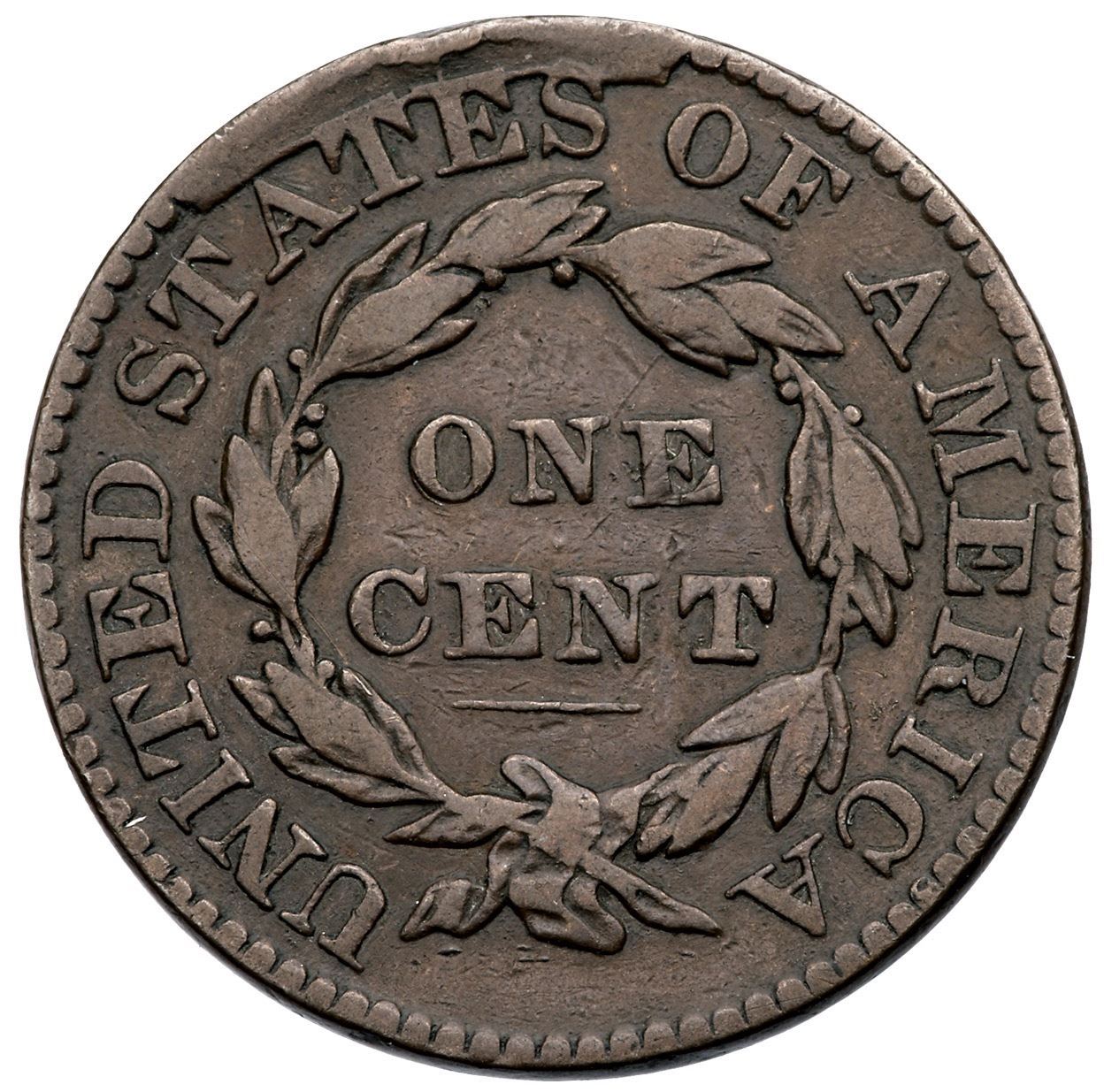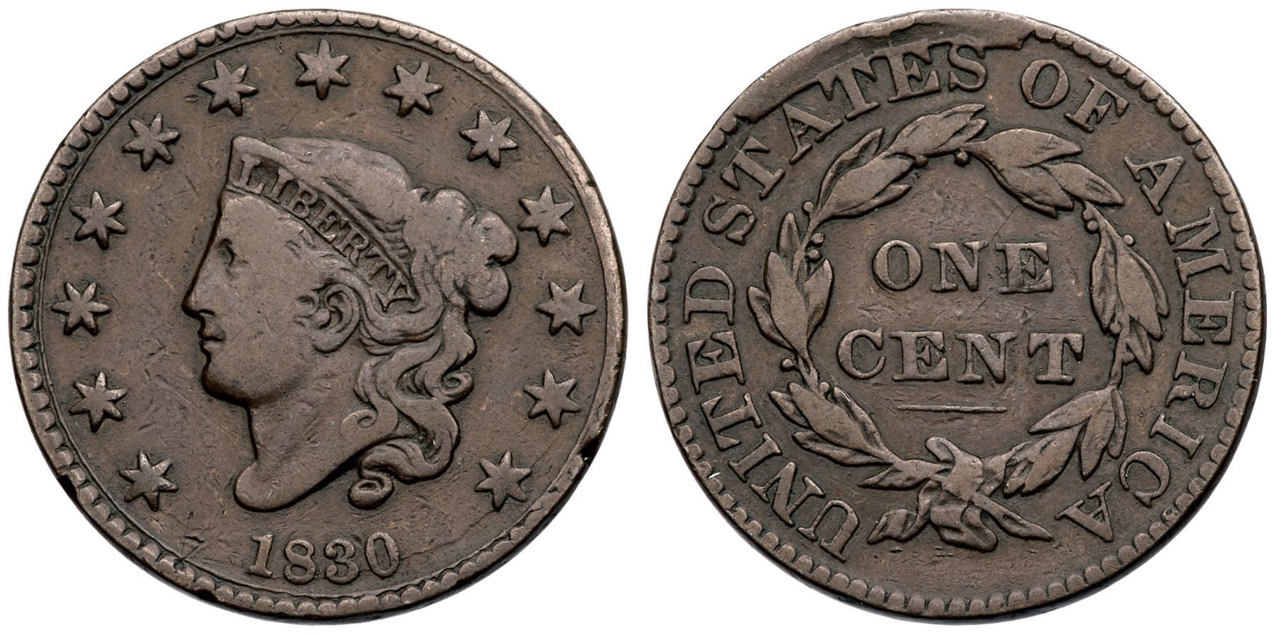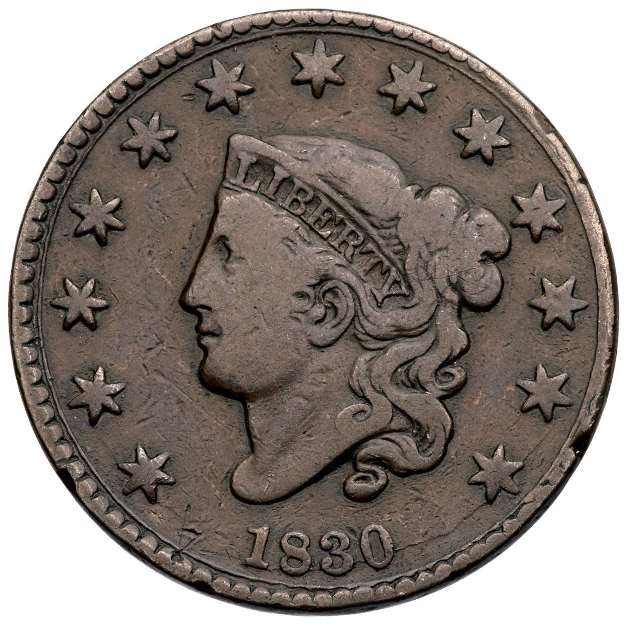 1830 N-10 R4+ Large Letters VG8+Glossy steel brown blending to chocolate in protected areas. Smooth with minor contact marks, close to VG10. A dull rim nick under star 12 is the best identifying mark. LDS, die state c early, with a raised retained cud break over ATES. A rare die state that comes with a very nice provenance.Certificate Number: Pedigree: Ex Henry C. Hines-Bruno Crossfield 12/1956-Willard C. Blaisdell 9/1976 (via Del Bland)-R. E. "Ted" Naftzger, Jr.-William C. Noyes 8/19/2011-Terry S. Denman Collection