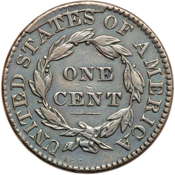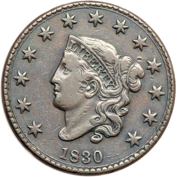 1830 N-10 R4+ VF25. VF-25. Glossy steel brown and chocolate with darker chocolate toning in protected areas and hints of bluish steel overtone. Possibly lightly cleaned and retoned, but the color and eye appeal are excellent. The notable marks are two tiny pinpricks on the bust tip, two slightly stronger ones at star 10, and a tiny nick on the reverse center dot. M-LDS with a partially raised retained cud break over ATES and a strong die crack up from the top of that E. The retained cud is raised at both ends but not in the center over the E. Tied for CC#11 overall but equal to the finest of the die state in the Noyes census. DWH #2467.