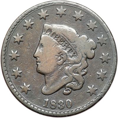 1830 N-10 R4+. VG-8 Plus. Glossy olive and chocolate brown with lighter brown toning on the obverse highpoints. The only notable mark is a horizontal nick over the N in CENT. Nice for the grade, close to VG10. EDS.