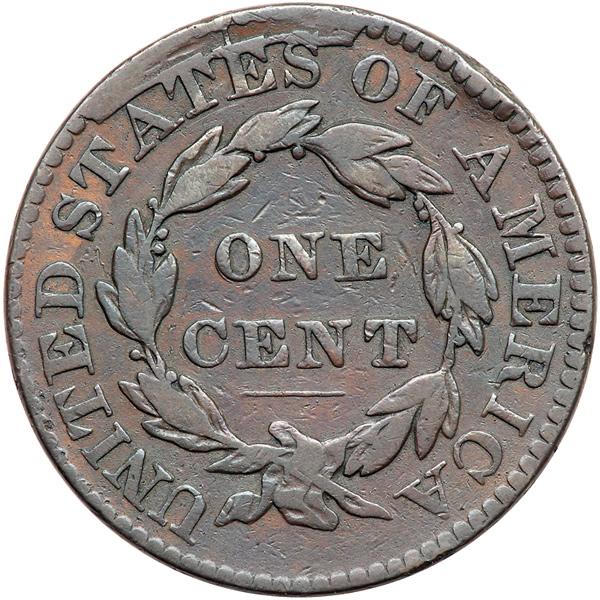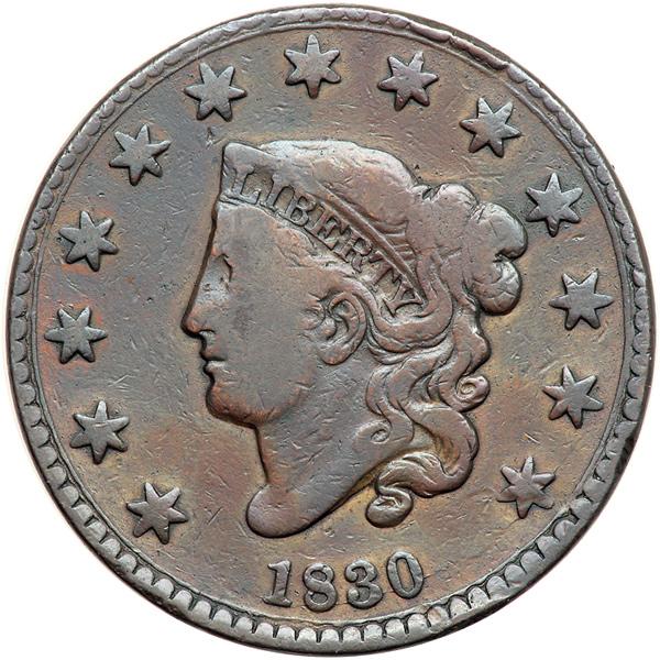 1830 N-10 R4+. VG-10. Slightly sharper but there is a rim dent at the F in OF. Otherwise the surfaces are smooth and free of notable marks. Recolored glossy olive and dark steel brown with frosty steel brown in protected areas. M-LDS with a raised retained cud break at ATES.