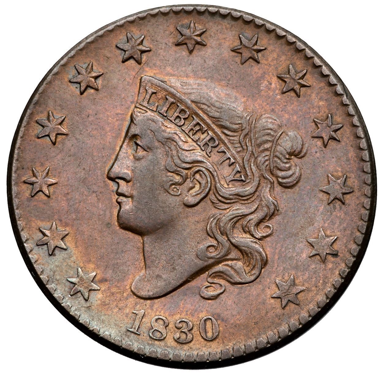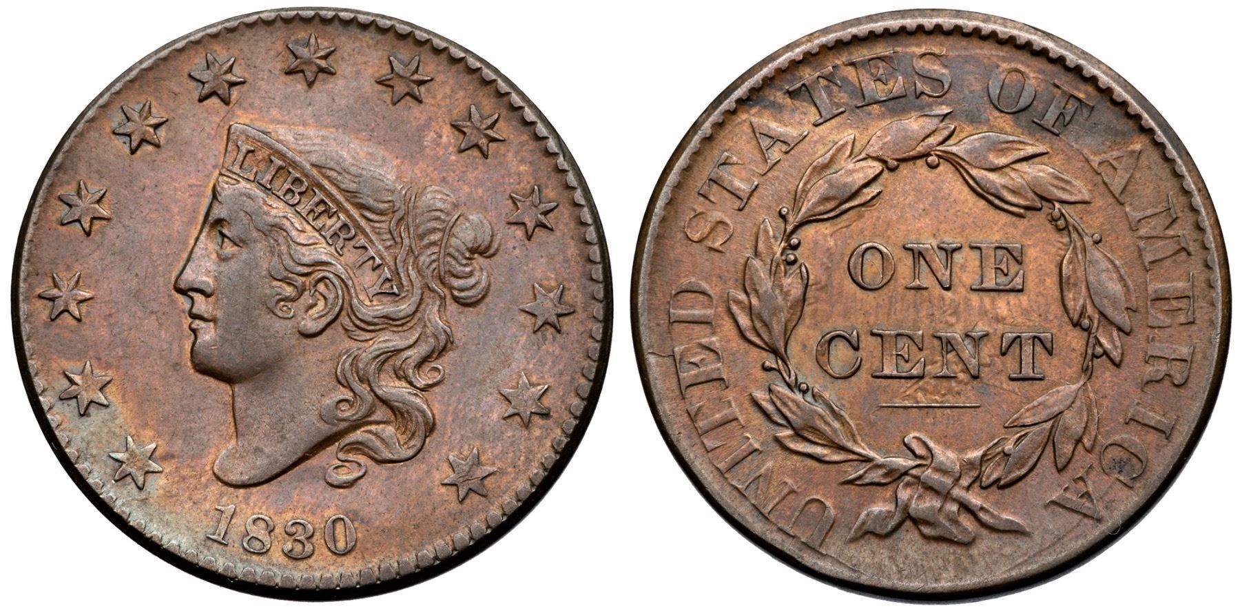 1830 N-11 R5 Large Letters VF35Five points sharper but lightly cleaned and beautifully retoned frosty light brown and tan with steel brown on the highpoints and underlying golden tan in protected areas. A splash of darker steel brown toning shows at the dentils from the 18 to star 2 and another at TES-OF. Smooth and quite attractive, void of any notable contact marks. The die clashmarks on the reverse are strong. MDS, the usual die state for the variety with both dies well worn from use in earlier marriages, especially the reverse. Called EF45 in the Noyes condition census and finest known by a full 10 points, his photo #28502. Bland says AU50 and CC#1 by 15 points in his census. Either way, this is clearly the finest known example of a very rare cent. Plated in the John Wright reference to illustrate the variety. A great example of this rare die variety.Certificate Number: Pedigree: Ex Ray Phillip (Cleveland, Ohio) 7/1982-John D. Wright 1/18/2006-J. R. "Bob" Grellman, Jr. & Chris McCawley 4/3/2006-Daniel W. Holmes, Jr., McCawley & Grellman Auctions/Goldbergs 5/30/2010:328-Adam Mervis, Heritage Auctions 1/10/2014:2147-Terry S. Denman Collection