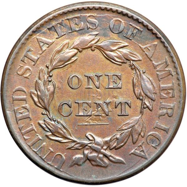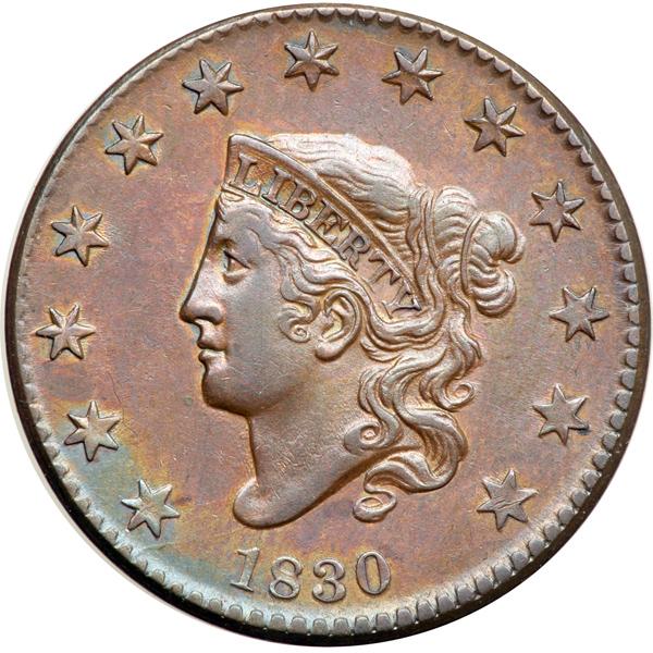 1830 N-11 R5 VF35. Wright Plate Coin. VF-35. Five points sharper but lightly cleaned and retoned glossy steel brown and chocolate with underlying golden tan in protected areas. A splash of light olive toning shows at the dentils from the 18 to star 2 and another at TES-OF. Otherwise free of any marks or other defects. The die clashmarks on the reverse are strong. EDS, the usual die state for the variety with both dies well worn, especially the reverse. Called EF45 in the Noyes condition census and finest known by a full 10 points, his photo #28502. Bland says AU50 and CC#1 by 15 points in his census. Either way, this is clearly the finest known example of a very rare cent. Plated in the Wright book to illustrate the variety. Another very important cent in Dan’s collection of Middle Date Large Cents. DWH #3152.