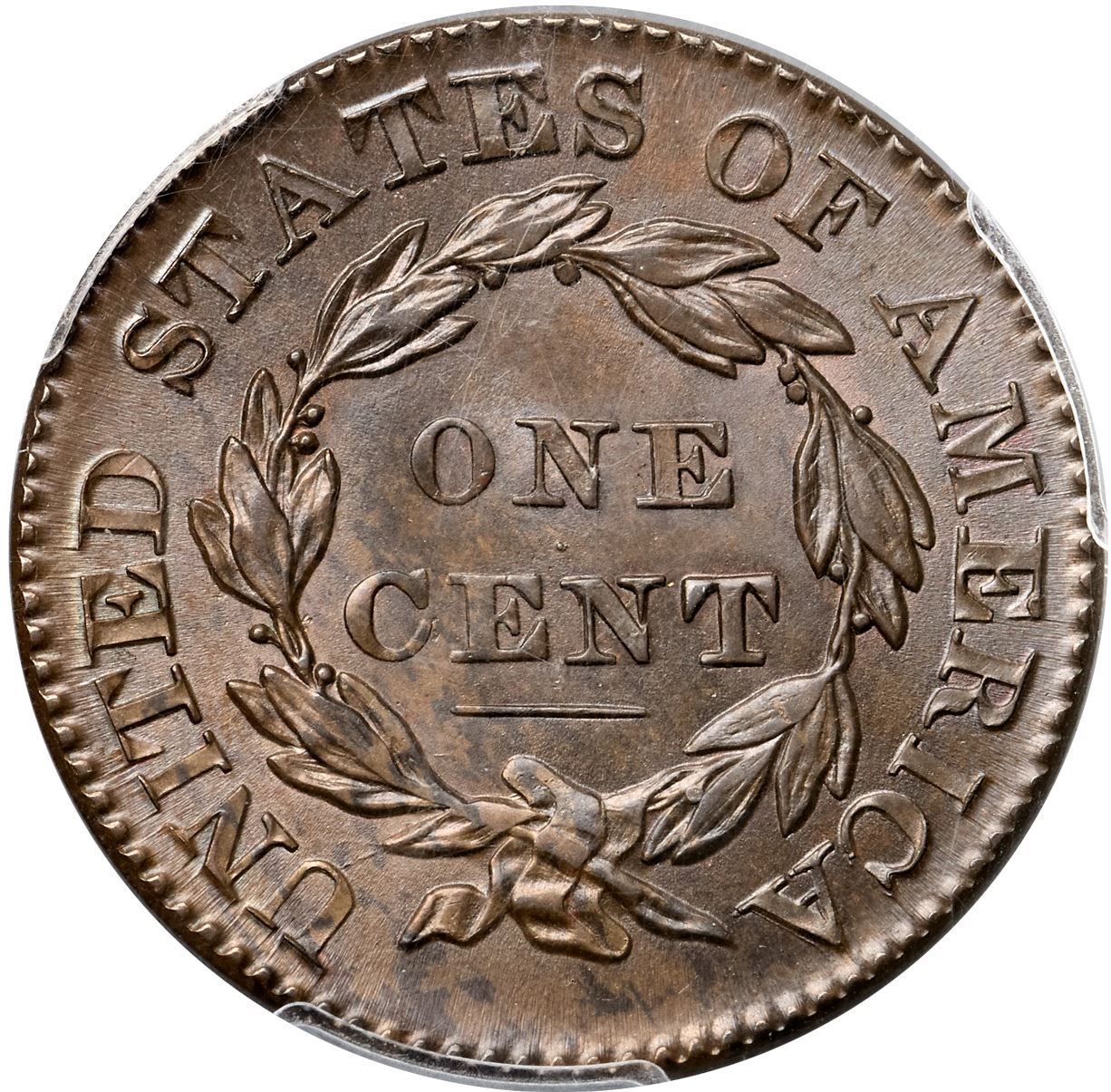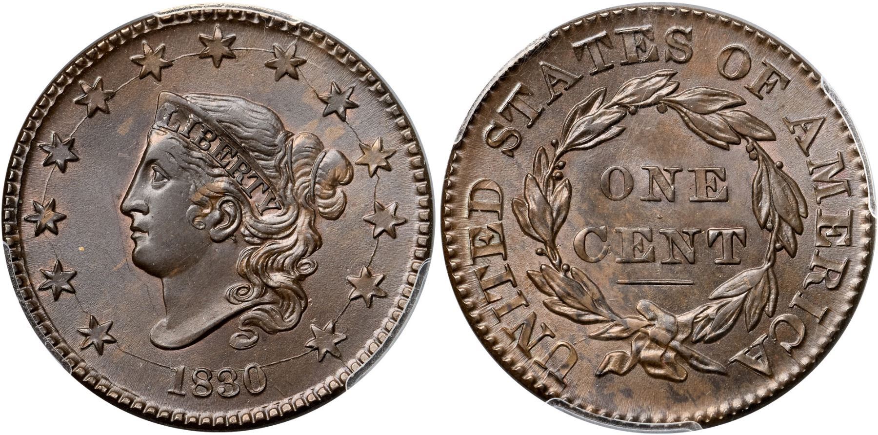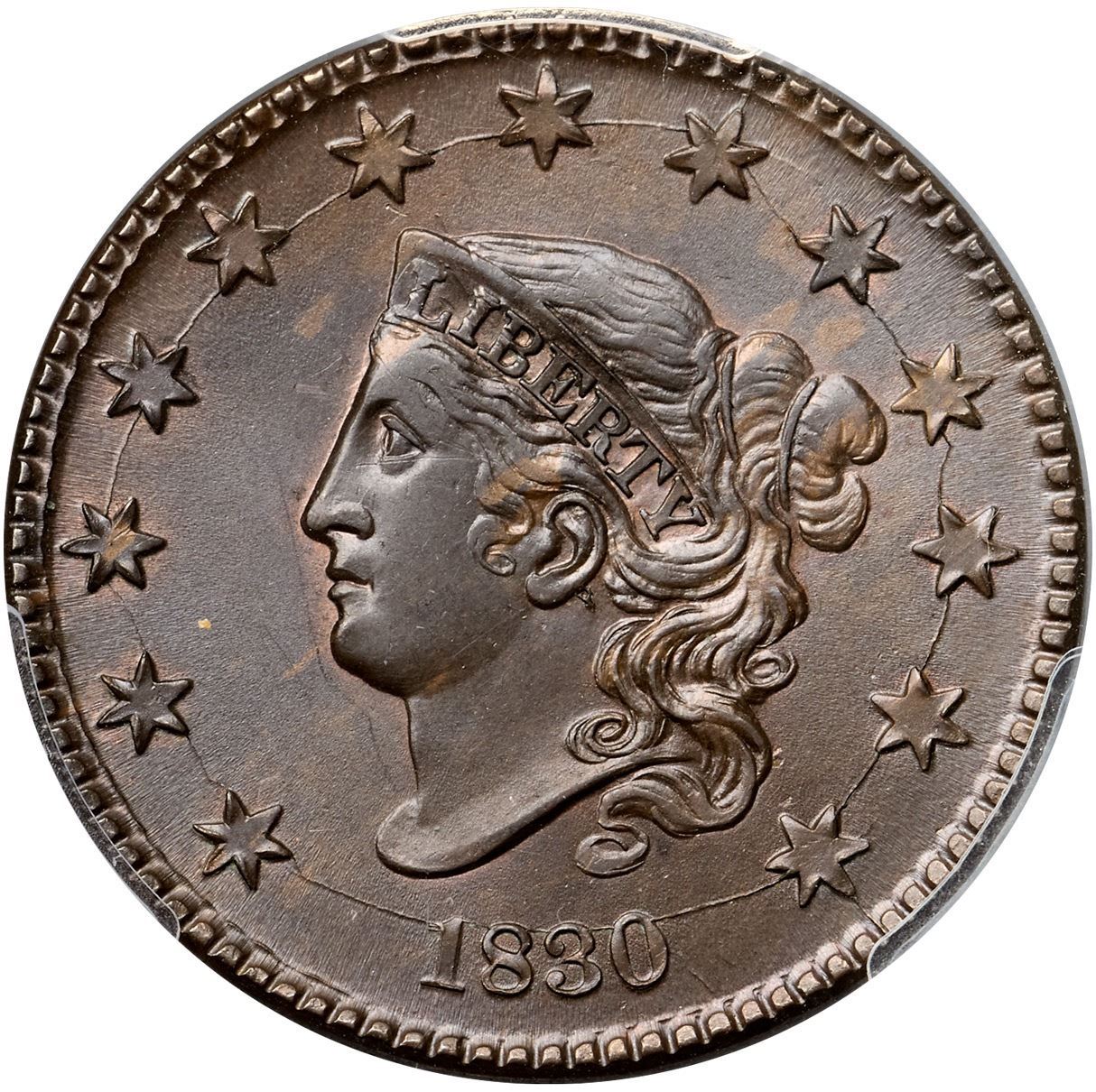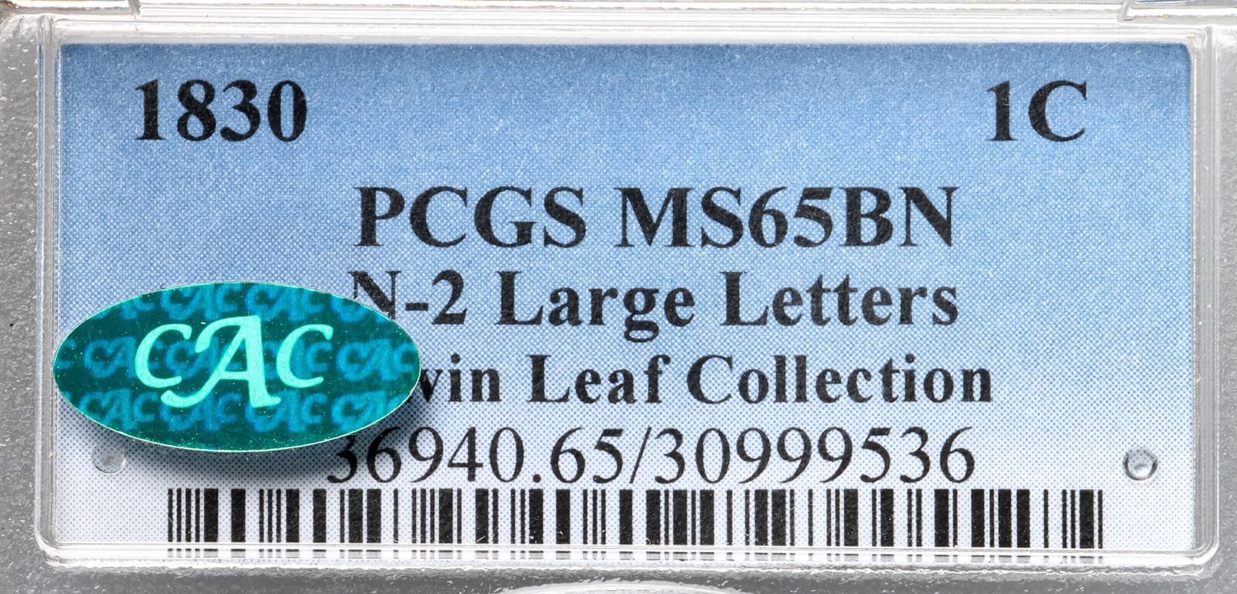 1830 N-2 R2 Large Letters, PCGS graded MS65 Brown, CAC ApprovedLustrous bluish steel brown with peeps of faded mint red in some of the protected areas. Small spots of slightly lighter tan toning are scattered over the upper half of the obverse and the lower left of the reverse is delicately mottled with lighter and darker shades of brown and olive. The surfaces are satiny and very attractive but the strike is soft (as often seen on this variety). The only notable marks are a hairline scratch close below the eye and another just right of the eye. MDS, die state b. The two die lines from the leaf tip below the U are segmented but still visible. Noyes photo #26945. Our grade is MS60. Comes with a very nice provenance.Certificate Number: 36940.65/30999536Pedigree: Ex Abe Kosoff 10/1961:617-Robert Gildred, Kagin's 10/14/1983:1116-John J. Nicholas, Superior 2/2/1992:553-Manuel Ahumada, McCawley & Grellman Auctions/Superior (2002 ANA Sale) 8/1/2002:272-W. M. "Jack" Wadlington (The Twin Leaf Collection), Stack's Bowers 7/16/2015:2182-Terry S. Denman Collection