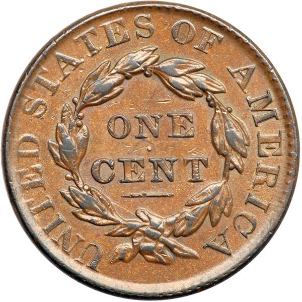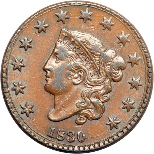 1830 N-3 R3 EF40. Rotated Reverse. EF-40. Glossy medium brown with frosty light bluish steel brown in protected areas of the obverse and a couple tiny peeps of faded mint red on the reverse. A few tiny ticks on the neck and cheek, none distracting. MDS, the usual die state with the reverse rotated 140 degrees CCW. DWH #0723.