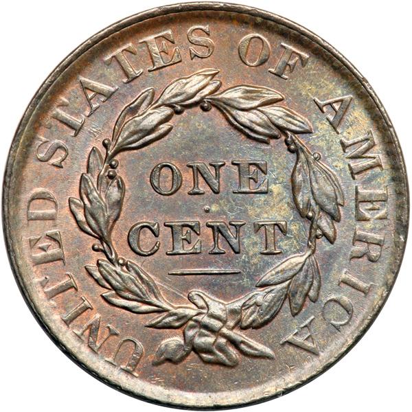 1830 N-3 R3 MS63. Rotated Reverse. Wright Plate Coin. PCGS graded MS-64 Red & Brown. Lustrous light bluish steel brown with 10% of the mint color remaining. The only mark is a small splash of reddish brown toning in the field right of star 4. The surfaces are satiny and the eye appeal is excellent. MDS. The obverse is cracked through the date and most stars, as always, and the reverse die is heavily worn from its use in the earlier N-8 marriage. The reverse is rotated 35 degrees CCW relative to a normal head-to-foot die orientation. Plated in the Wright book to illustrate the variety. Called MS65 "Choice" and tied for CC#1 honors with one other piece in the Noyes census, his photo #28553. Called MS63 and CC#2 in the Bland census. Either way, this is a great cent. Our grade is MS63. Pop 1; The only graded example at PCGS. DWH #3145.