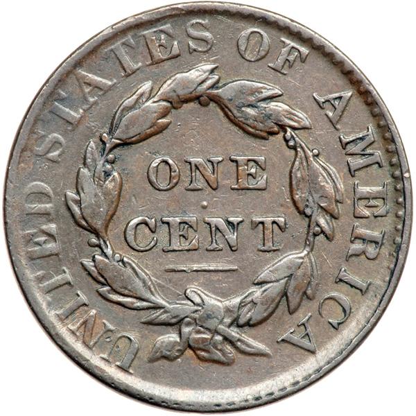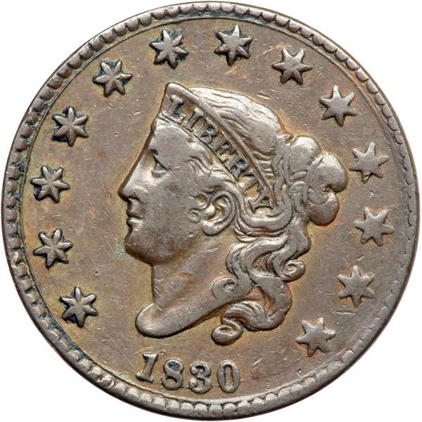 1830 N-3 R3 VF20+. Rotated Reverse. VF-20+. Glossy chocolate and light olive brown with frosty light brown toning in protected areas. No notable defects, close to VF25. MDS, the usual die state but the reverse is rotated 135 degrees CW. DWH #2385.