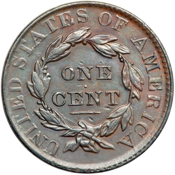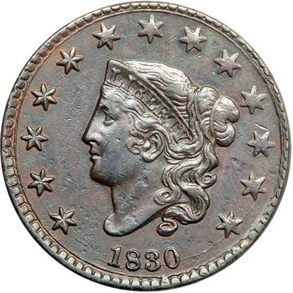 1830 N-3 R3 VF25. Rotated Reverse. VF-25. Sharpness EF40 with small, very shallow pitmarks scattered about the obverse. A few light contact marks on both sides, including a small nick on the right top of the O in ONE. Rather glossy steel brown and chocolate. MDS, the usual die state with the reverse rotated 170 degrees CCW, nearly upset head-to-head. DWH #2386.