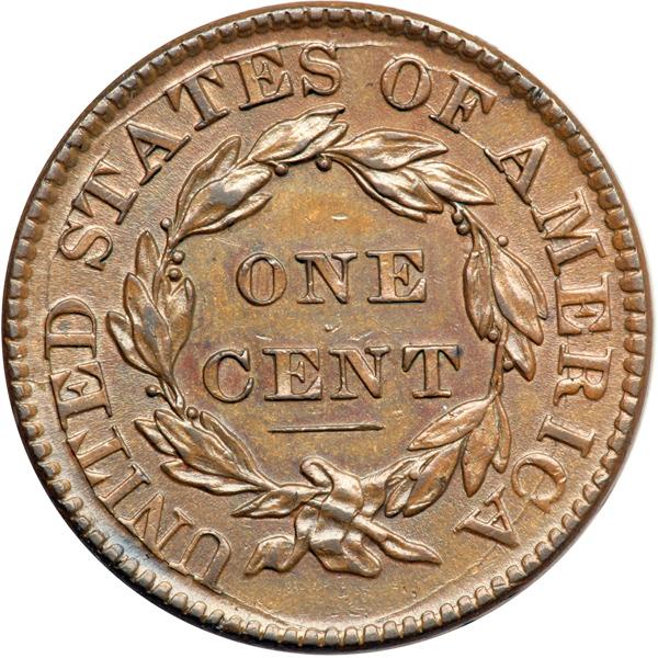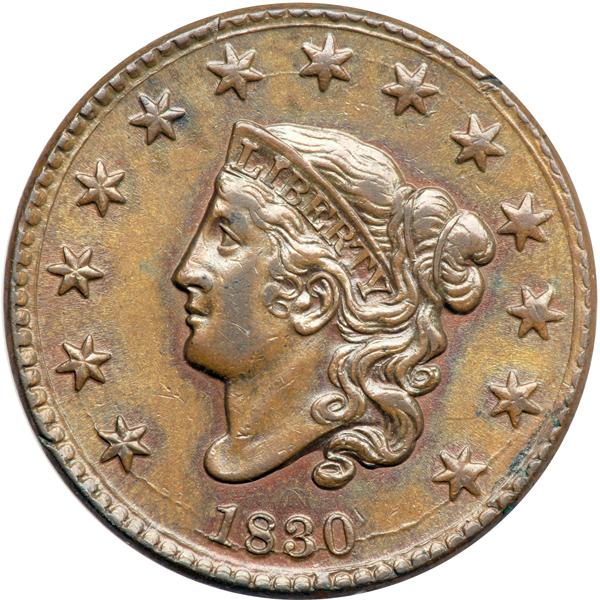 1830 N-4 R2 EF40. EF-40. Five points sharper but lightly cleaned, now nicely retoned glossy golden light brown and tan with traces of very faded red in protected areas of the obverse. A small rim nick over star 9 and a thin line of light verdigris on the dentil tips from star 12 to star 13 are the only marks on this attractive cent. MDS with a fine die crack up from the right top of E in UNITED to the dentils above and the reverse is rotated 25 degrees CCW. DWH #0727.