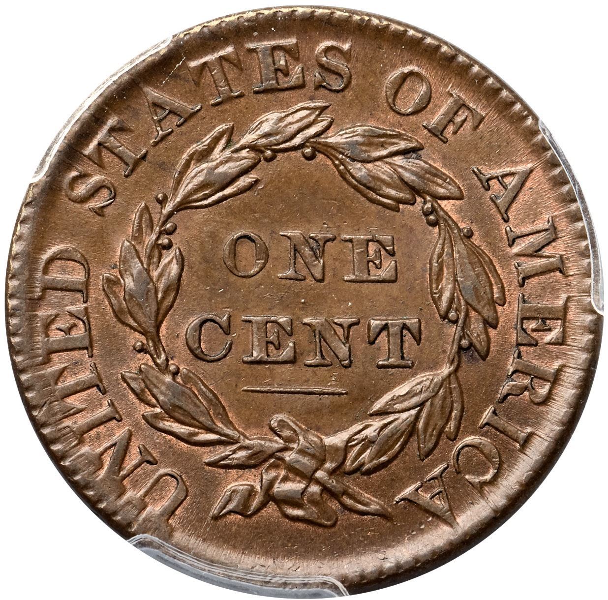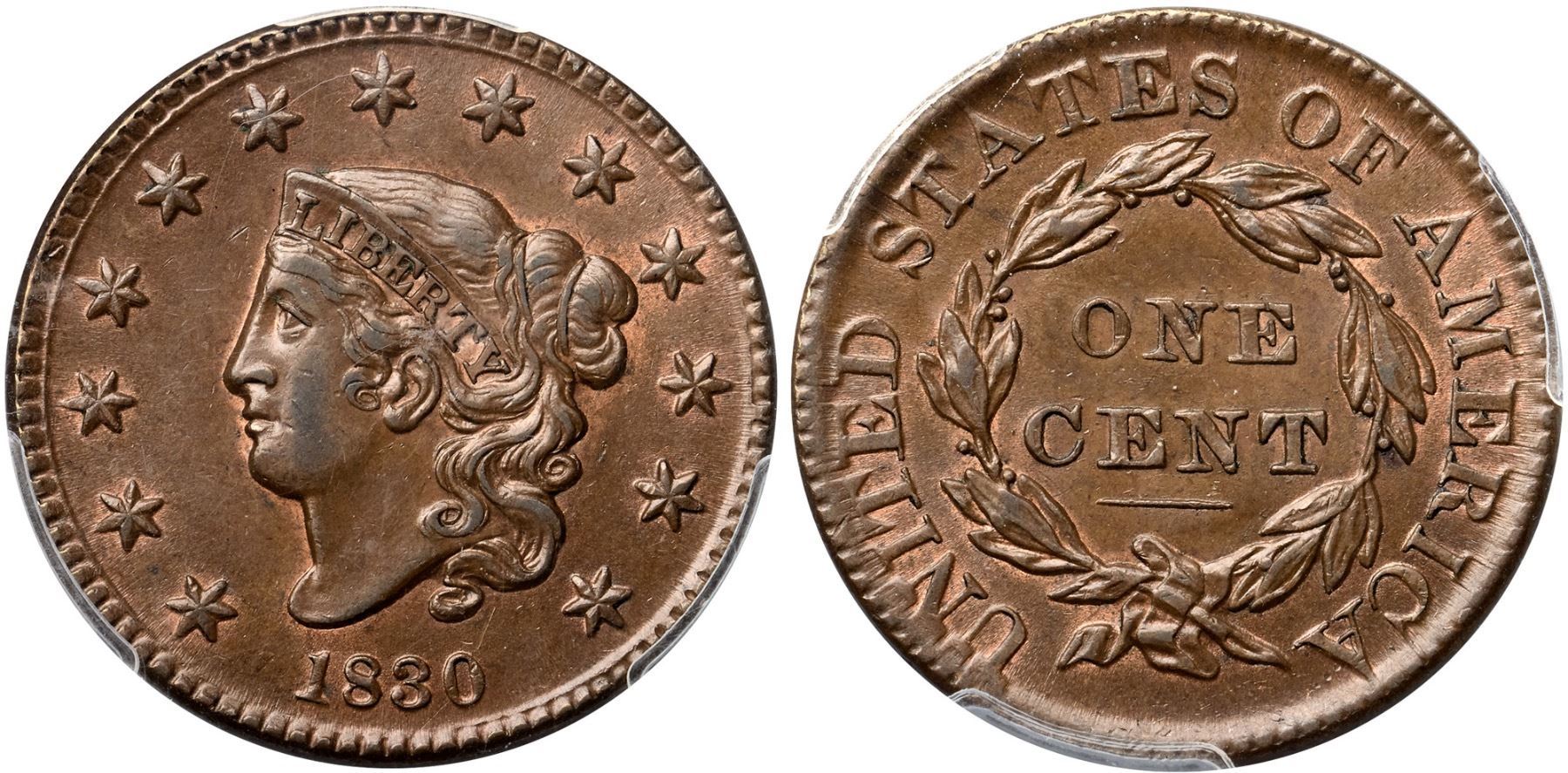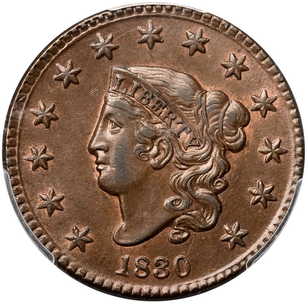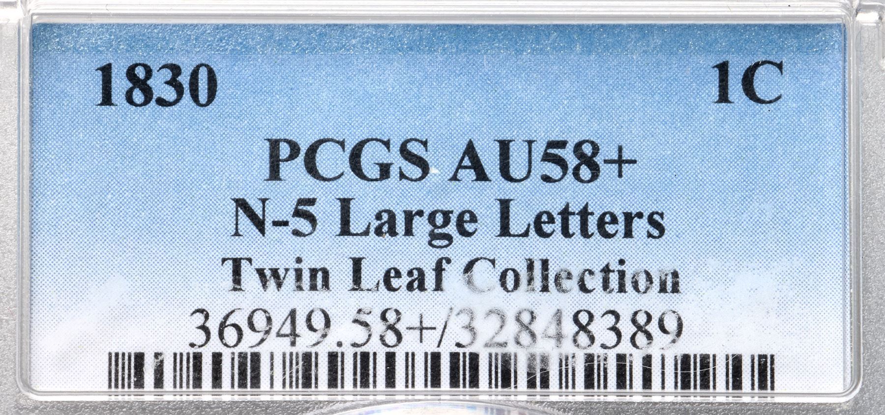 1830 N-5 R3 Large Letters, PCGS graded AU58+Very attractive glossy light to medium brown with mint red in protected areas and slightly darker steel brown on the highpoints of the obverse. This cent has mint state eye appeal but there is a light touch of friction on the highpoints. The best identifying mark is a small spot of darker reddish brown toning on the berry under the R in AMERICA. MDS with very fine radial die flowlines on the obverse. Graded AU50 and tied for CC#5 in the Noyes census, his photo #22248. Our grade is AU50, but this cent has the eye appeal of a higher grade. (The holder is scuffed.)Certificate Number: 36949.58+/32848389Pedigree: Ex Herman Halpern, Stack's 3/16/1988:418-Dennis Mendelson, Superior 2/3/1991:398-R. S. "Robbie" Brown, Jr., Superior 1/27/1996:558-Chris McCawley 2/2000-W. M. "Jack" Wadlington (The Twin Leaf Collection), Stack's Bowers 3/30/2016:10111-Terry S. Denman Collection