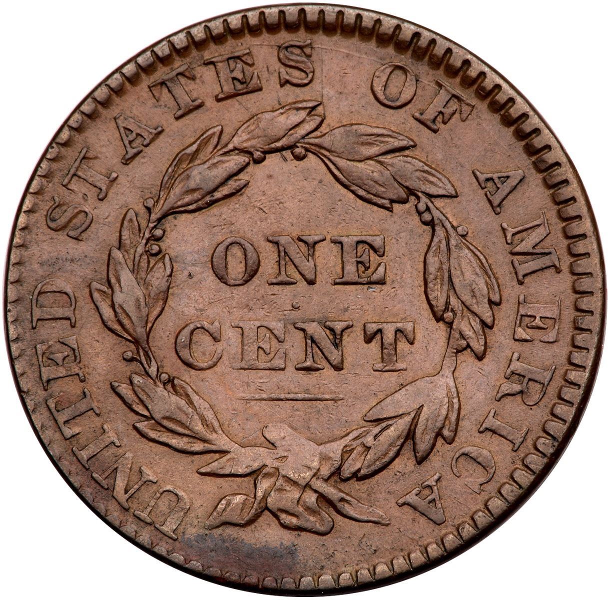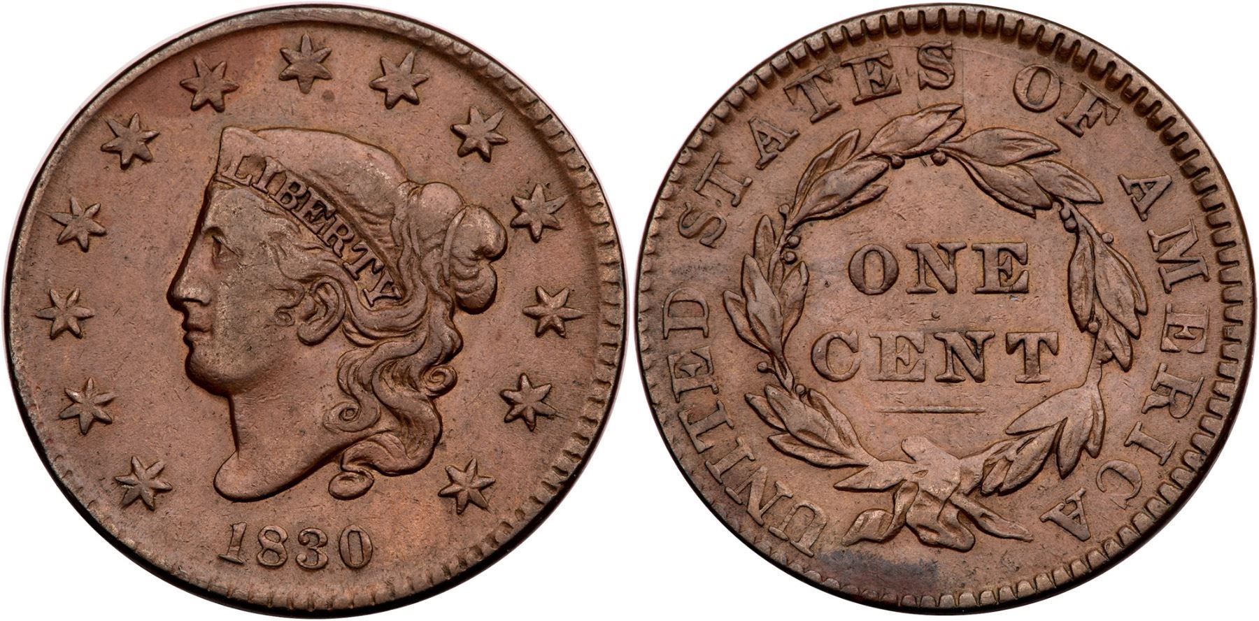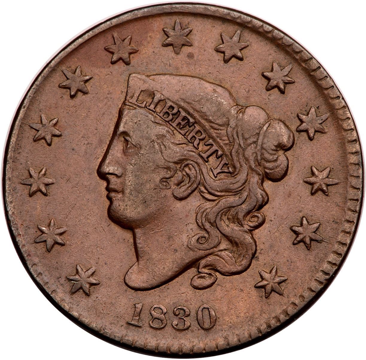 1830 N-6 R-4 Small Letters Reverse VF20Choice tan brown surfaces except an area of ruddy brown at star 6 and a strip of oxidation on the bottom reverse and edge below the ribbon. The only marks are a couple faint hairline scratches under ES in STATES and a few on Liberty's cheek only visible under a glass, all that blend in well. Smooth surfaces. EDS.Certificate Number: Pedigree: Ex; Tom Reynolds - Buck Burgess