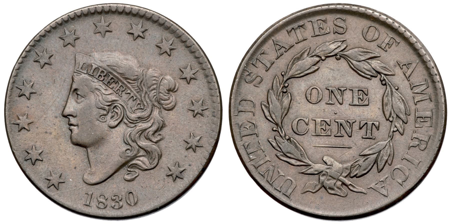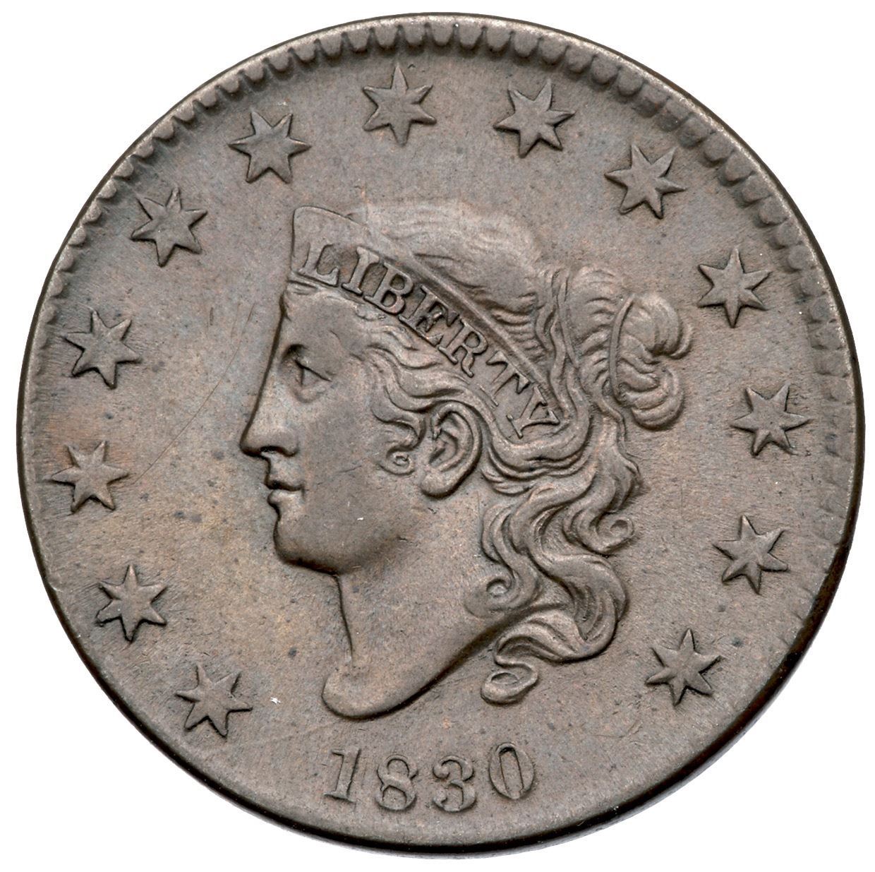 1830 N-7 R3 Large Letters VF35Choice glossy light olive and medium steel brown. The surfaces are smooth and covered with satiny luster, and this cent has great eye appeal. The only mark is a faint hairline scratch in the field from near star 3 to before the forehead, and this mark is not visible to the unaided eye. M-LDS with the tip of the coronet and stars weakly struck, as usual. The die crack from the bust tip to the rim under star 1 is clear. Called VF35 and tied for CC#2 in the Noyes census, his photo #28280. Bland also says VF35 and has it tied for CC#2 among the confirmed examples in his census. A beautiful cent that comes with an outstanding provenance.Certificate Number: Pedigree: Ex Howard R. Newcomb, J. C. Morgenthau & Co. 5/16/1945:618-Floyd T. Starr, Stack's 6/13/1984:238-Jack H. Robinson, Superior 1/29/1989:911-J. R. Frankenfield, McCawley & Grellman Auctions/Superior 2/17/2001:941-Daniel W. Holmes, Jr., McCawley & Grellman Auctions/Goldbergs 5/30/2010:319-Terry S. Denman Collection