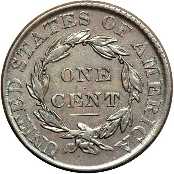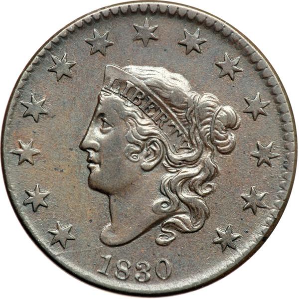1830 N-7 R3 VF35. VF-35. Glossy olive and medium steel brown. The surfaces are smooth and covered with satiny luster. The only mark is a faint hairline scratch in the field from near star 3 to before the forehead. M-LDS with the tip of the coronet and stars weakly struck, as usual. Everything else is well struck and the overall eye appeal is excellent. The die crack from the bust tip to the rim under star 1 is clear. Called VF35 and tied for CC#2 in the Noyes census, his photo #28280. Bland also says VF35 and has it tied for CC#2 among the confirmed examples in his census. Comes with an outstanding provenance. DWH #1907.