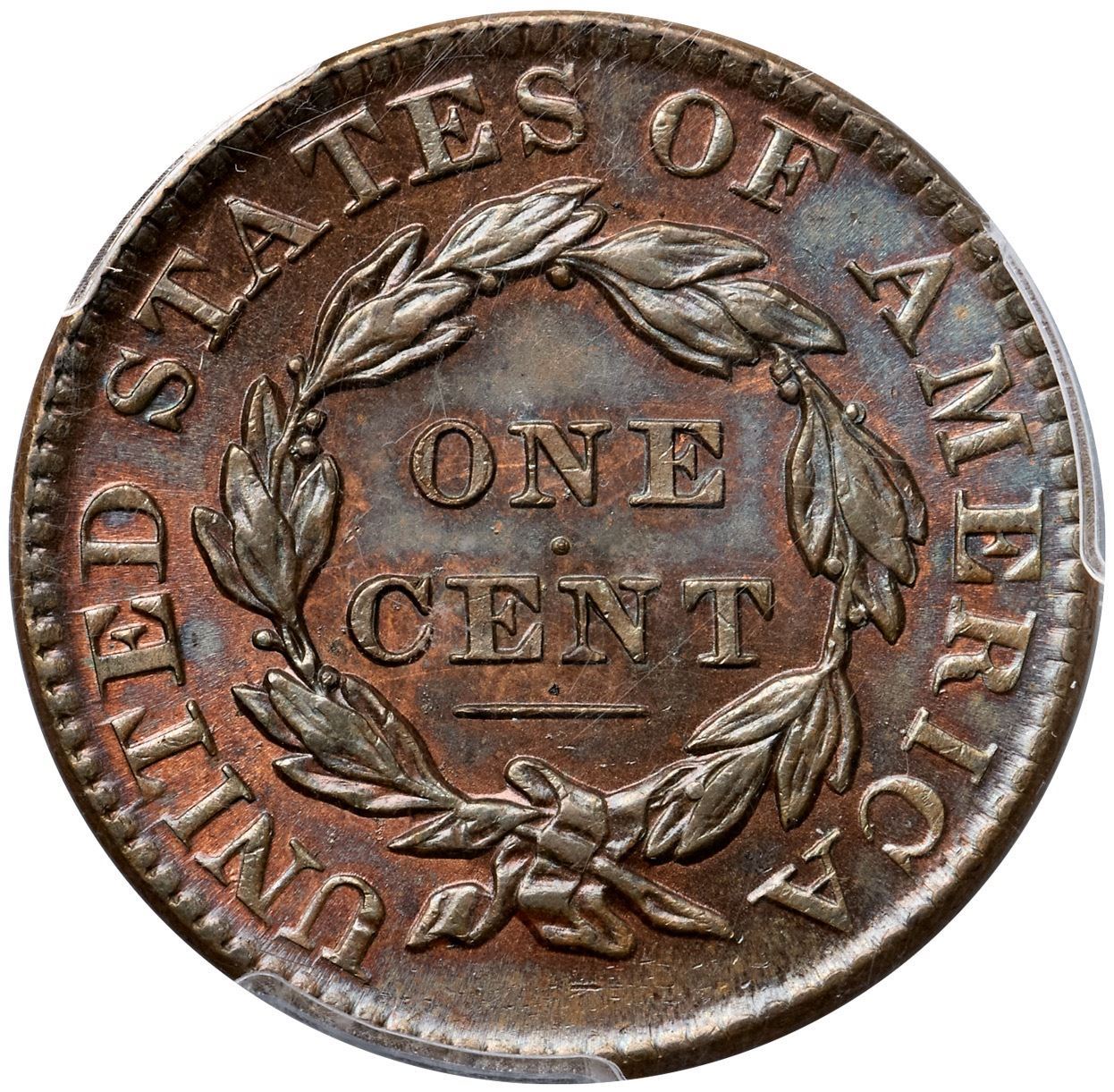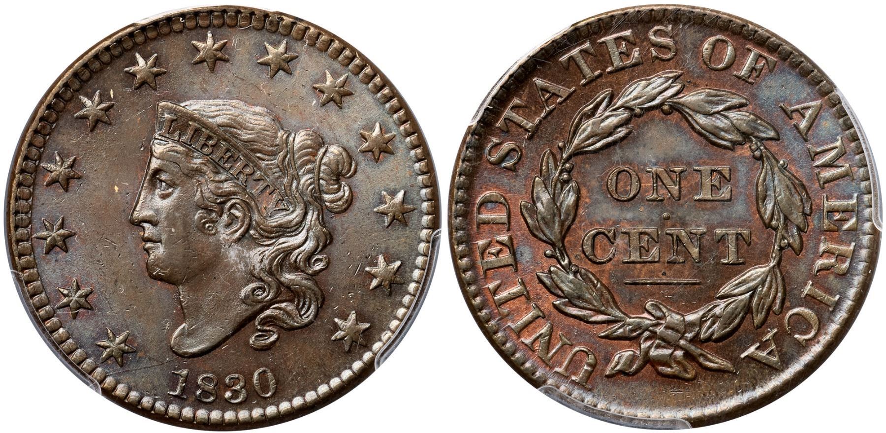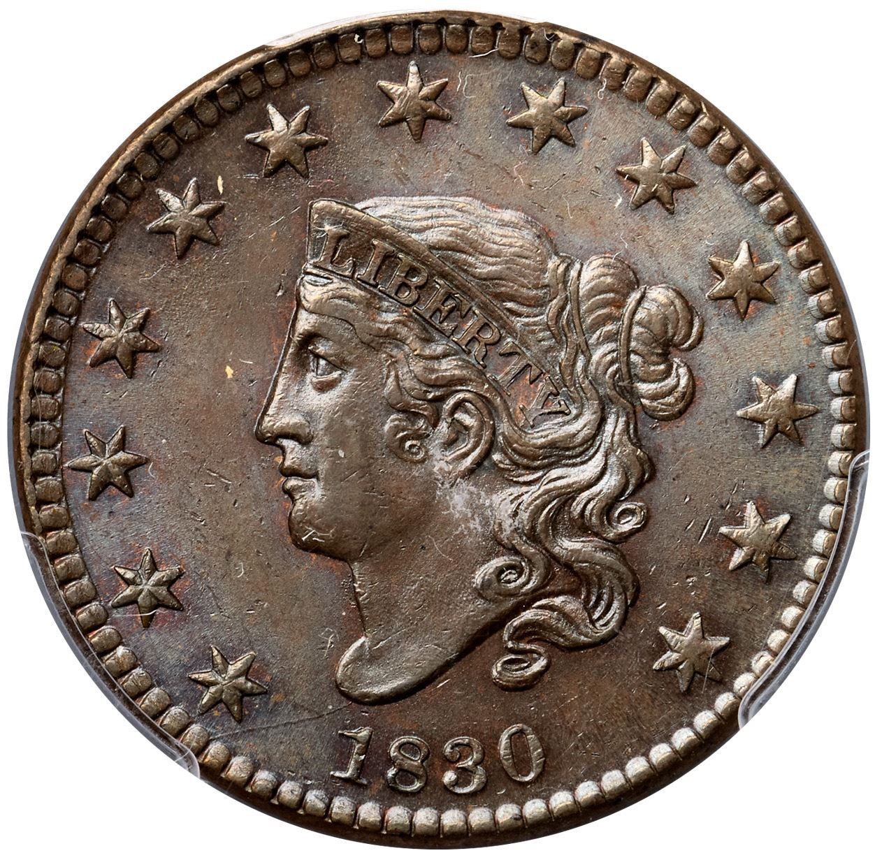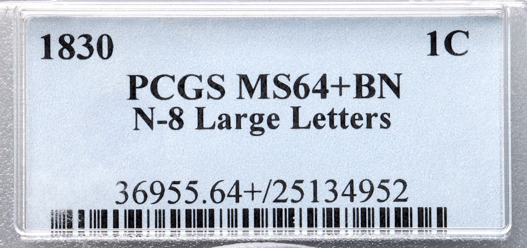 1830 N-8 R1 Large Letters, PCGS graded MS64+ BrownLustrous bluish steel and light chocolate with a few peeps of faded mint red on the obverse and at least 10% of the reverse retaining mellowed mint color. No spots or stains, and the only contact marks are some microscopic ticks scattered over the obverse, mostly in the fields. A shallow low spot between the chin and star 2 can help identify this cent. The reverse is choice. MDS, die state b. The die crack from the bust tip to the dentils under star 1 is clear but the repunching along the left edge of the 1 in the date is still visible. Called MS63 and tied for CC#1 honors in the Noyes census, his photo #20311. Bland says MS60+. Our grade is MS60+.Certificate Number: 36955.64+/25134952Pedigree: Ex Bowers & Ruddy 1971-Jack Collins, Bowers & Ruddy 10/1977:903-R. E. "Ted" Naftzger, Jr., 1989 EAC Sale, lot 317-John J. Nicholas, 1991 EAC Sale, lot 214 (as MS63)-J. R. Frankenfield, McCawley & Grellman Auctions/Superior 2/17/2001:944-Chris McCawley 1/2002-Paul Gerrie, 5/27/2012:31-Terry S. Denman Collection