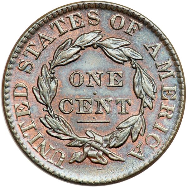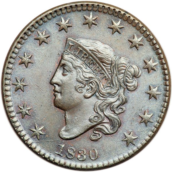 1830 N-8 R1 Large Letters Reverse MS60+. Lustrous bluish steel and chocolate with traces of faded mint red showing on the obverse and at least 10% of the reverse retaining mellowed mint color. No spots or stains, and the only contact marks are some microscopic ticks scattered over the obverse, none notable. The reverse is choice. MDS. The die crack from the bust tip to the dentils under star 1 is clear but the repunching along the left edge of the 1 in the date remains visible. Called MS63 and tied for CC#1 honors in the Noyes census, his photo #20311. Bland says MS60+. Removed from a PCGS slab graded MS64BN (PCGS label included).