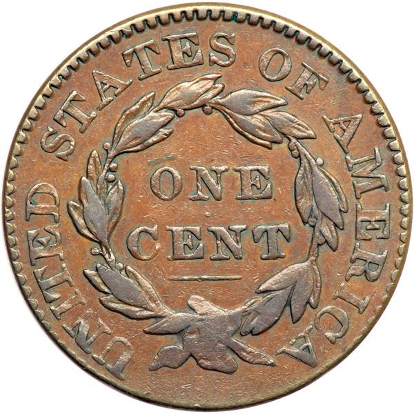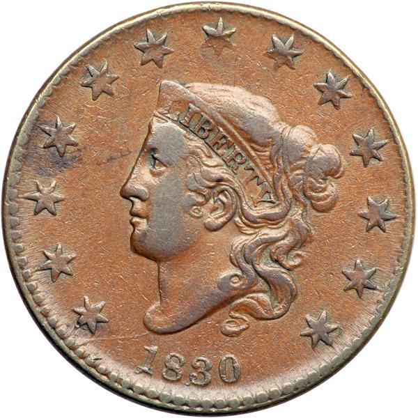 1830 N-9 R6+ VF30. Wright Plate Coin. VF-30. Choice glossy medium brown with frosty flowline luster covering the obverse fields. A small splash of olive brown toning under star 4 is the only mark. EDS, the only known die state. The stars are not fully struck up, as always, and the ones above the head are especially weak. The bottom of the wreath is also softly impressed thanks to the dies being out of proper parallel alignment. However, the planchet and surfaces are outstanding, choice in every respect. The reverse fields are hard and slightly reflective and the dentils are sharp indicating the reverse die is new. An outstanding example of this extremely rare variety, the rarest of the "in Newcomb" varieties in the 1816-1839 series. Called VF30 and CC#2 in the Bland census. Noyes says VF30 net VF25 and CC#3, his photo #25110. DWH #3150.