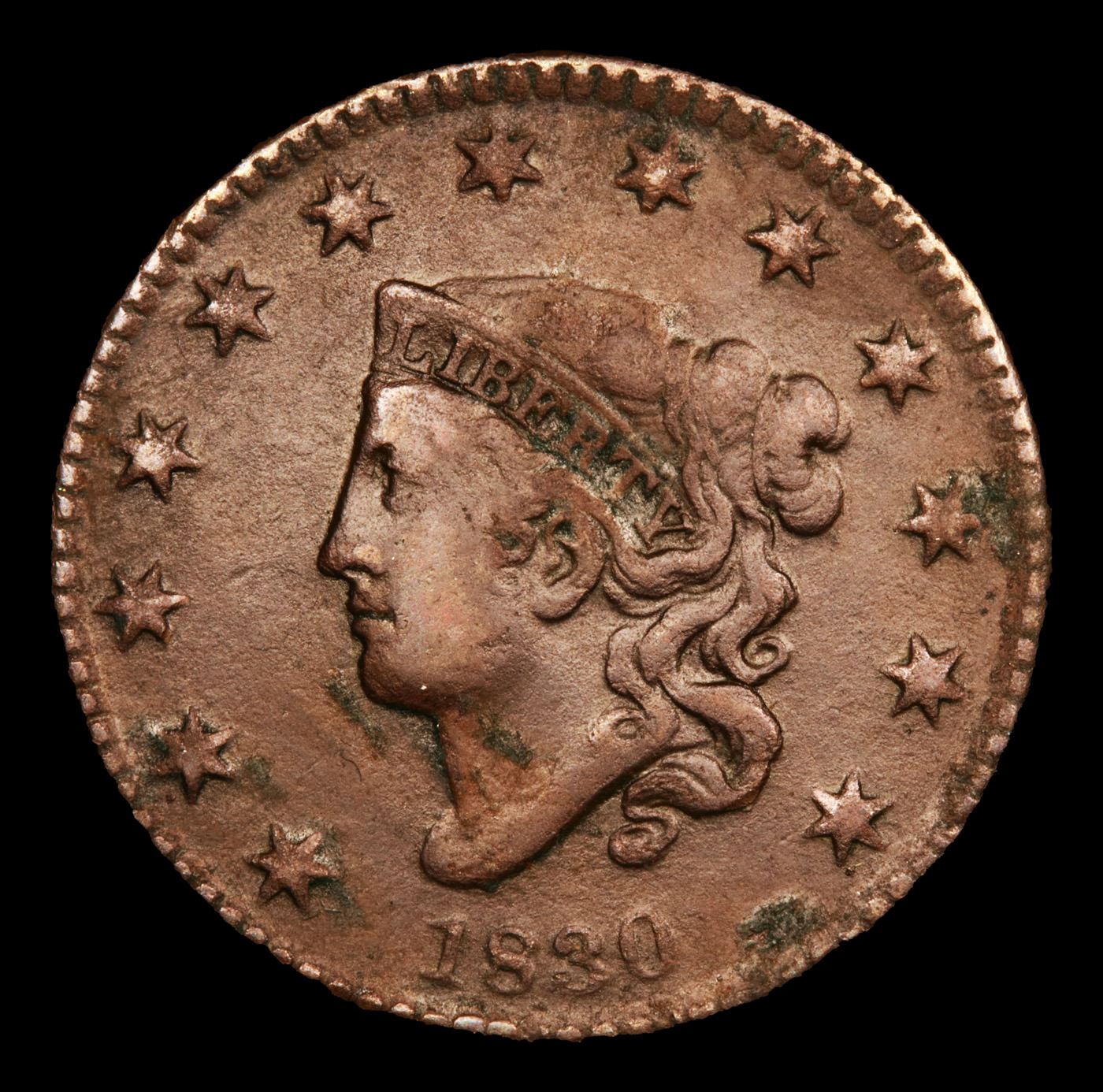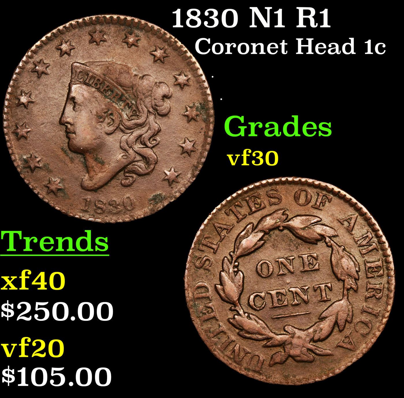 1830 N1 R1 Coronet Head Large Cent 1c Grades vf++.