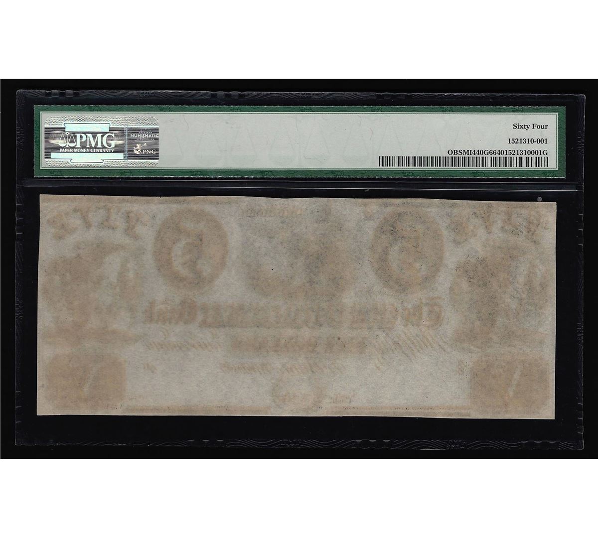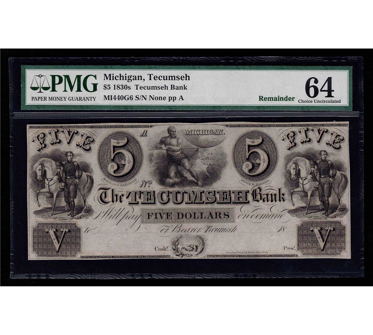 One 1830'S $5 The Tecumseh Bank Obsolete Bank Note PMG CU64. PMG Certified.