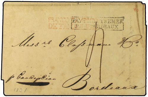 1830 TAMPICO a FRANCIA. Marca FRANCO TAMPICO/DE TAMAULIPAS para indicar que el porte local estaba pagado en origen, marca de entrada PAYS D´OUTREMER/PAR BORDEAUX.